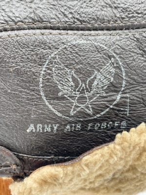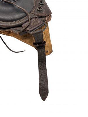 Bonnet de vol Type A-11 USAAF Marquage intérieur visible : Type A-11, Specification 3189, Property Air Forces U.S. Army Fabricant : The Selby Shoe Co. (un des sous-traitants qui produisaient ces casques pour l’USAAF). Taille : Large Cuir marron, intérieur en daim clair, typique des casques de vol A-11 adoptés à partir de 1943. Utilisé…