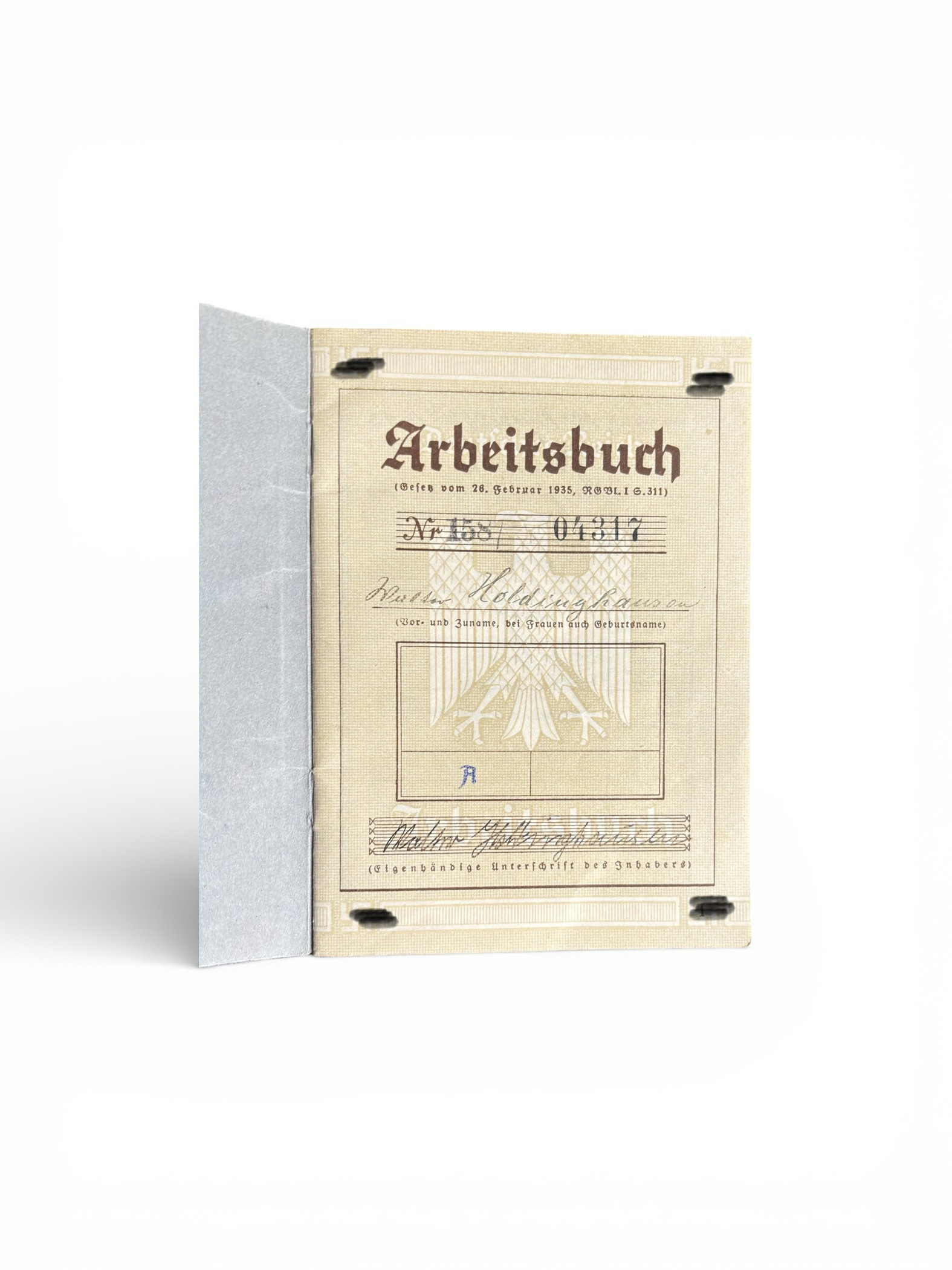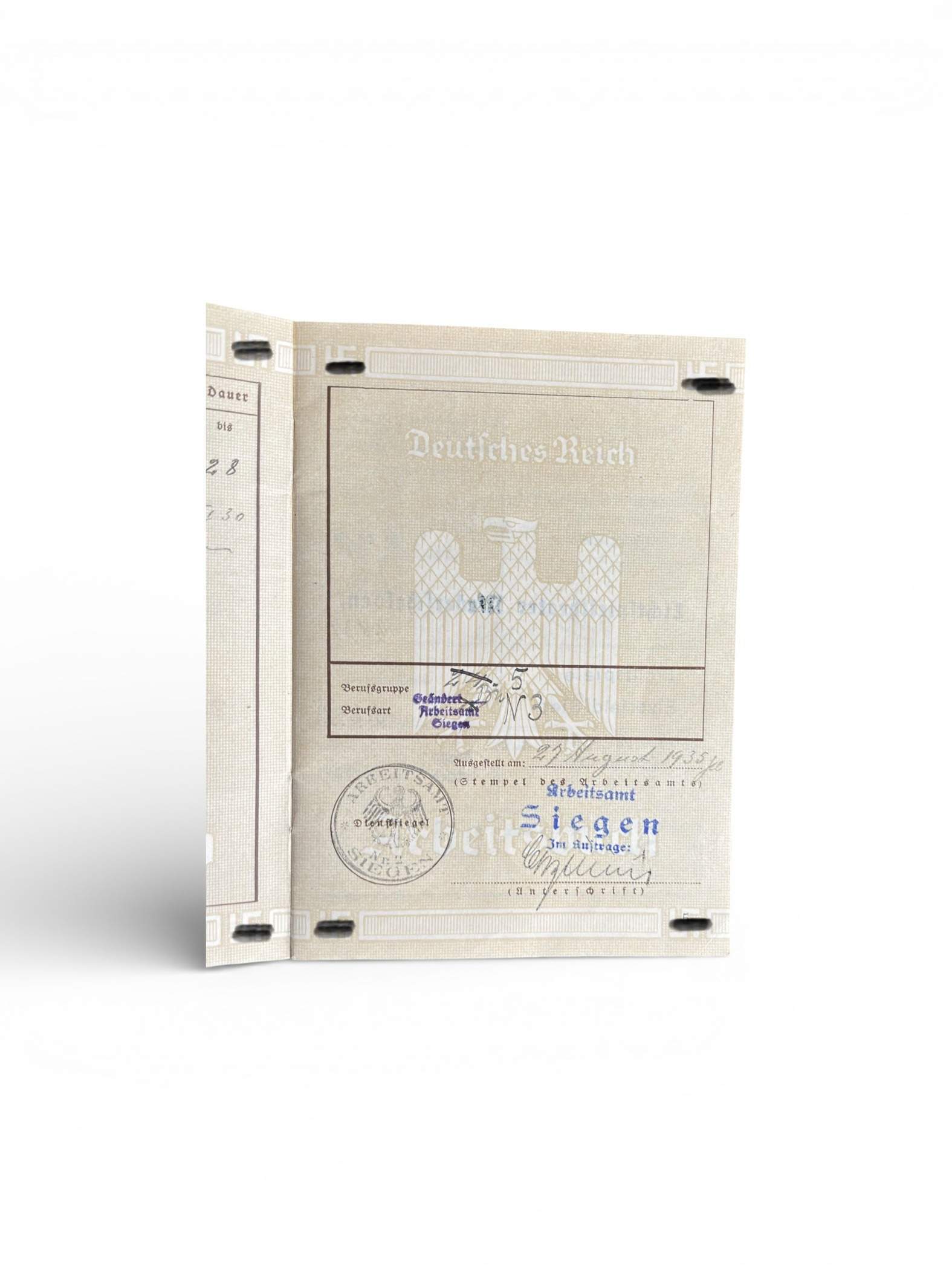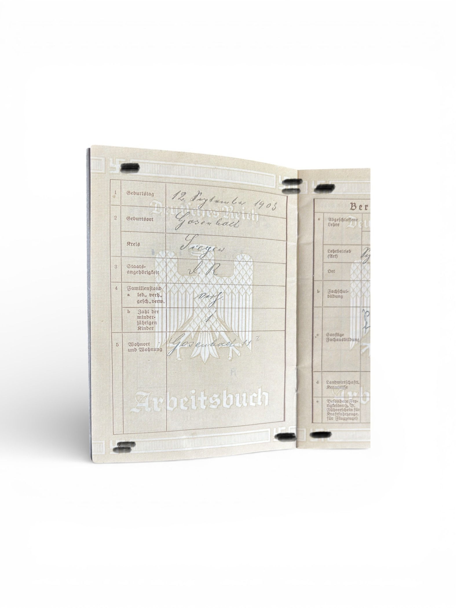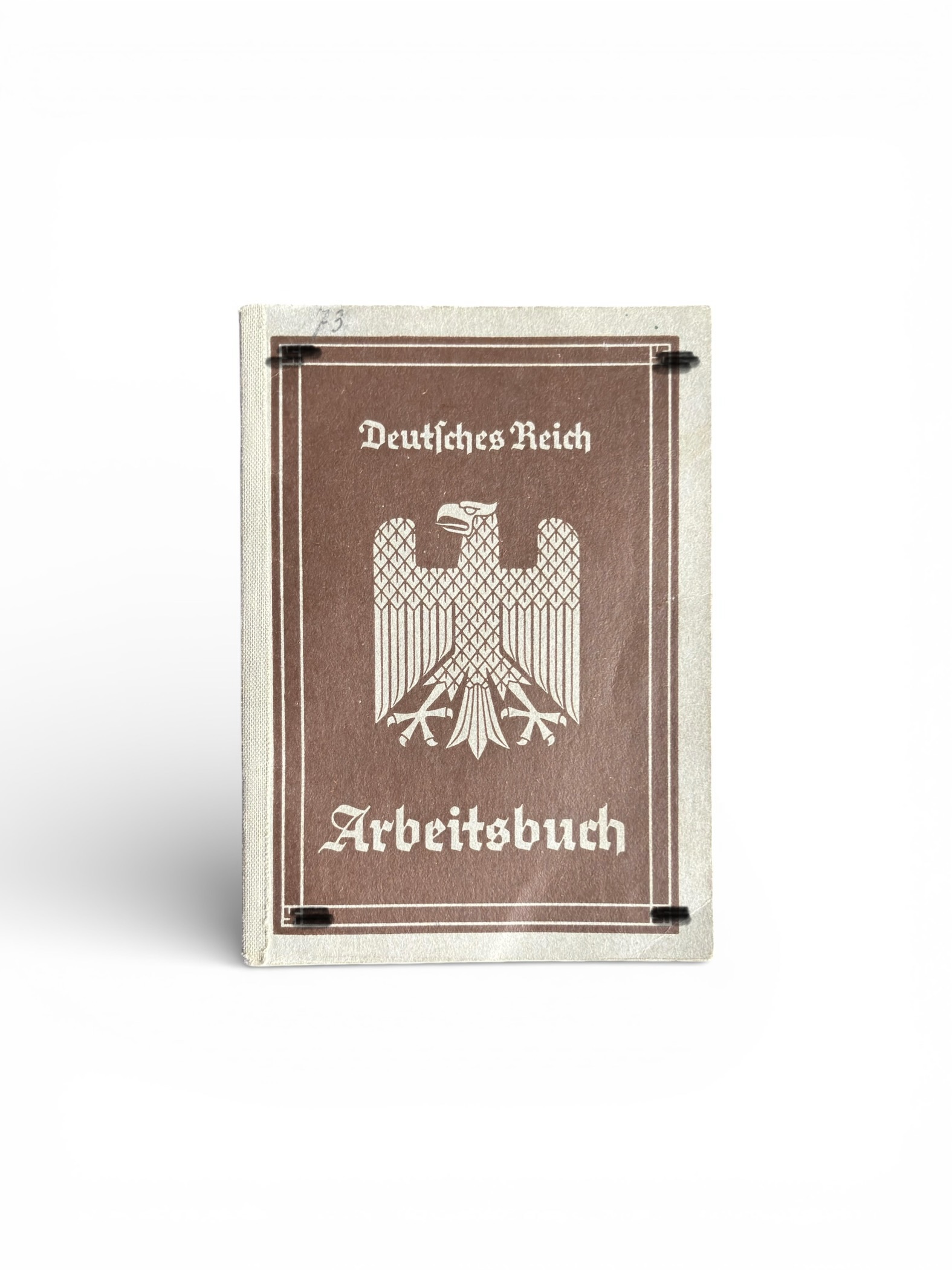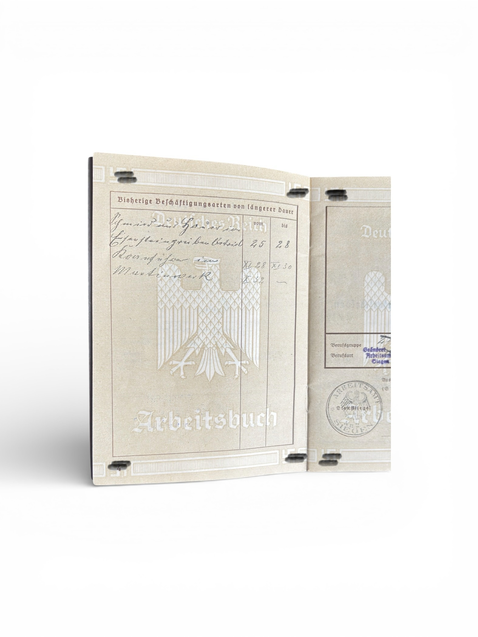 Authentique livret de travail allemand (Arbeitsbuch) délivré sous le Troisième Reich. Ce document officiel servait à enregistrer l’identité du travailleur ainsi que son parcours professionnel.