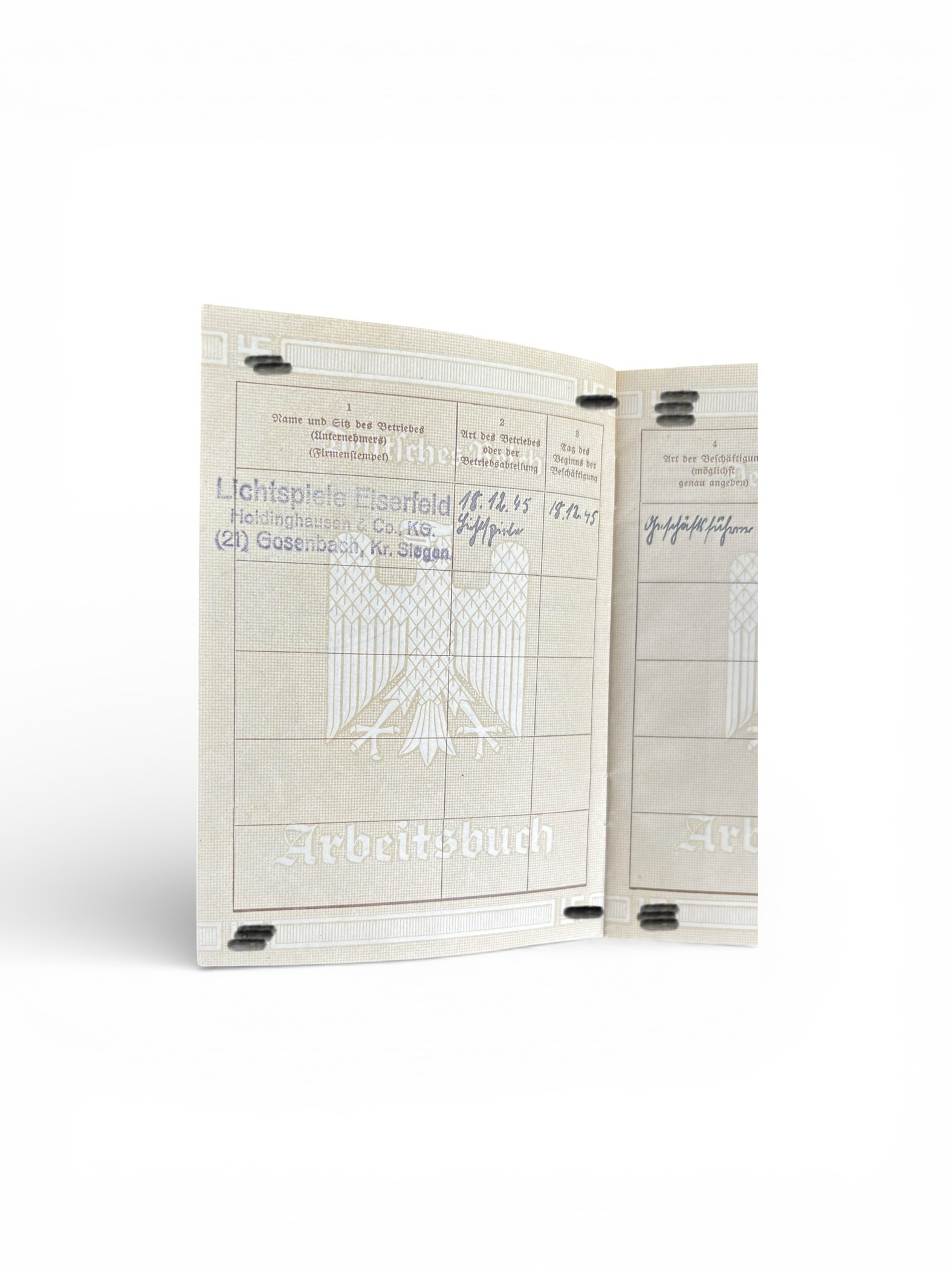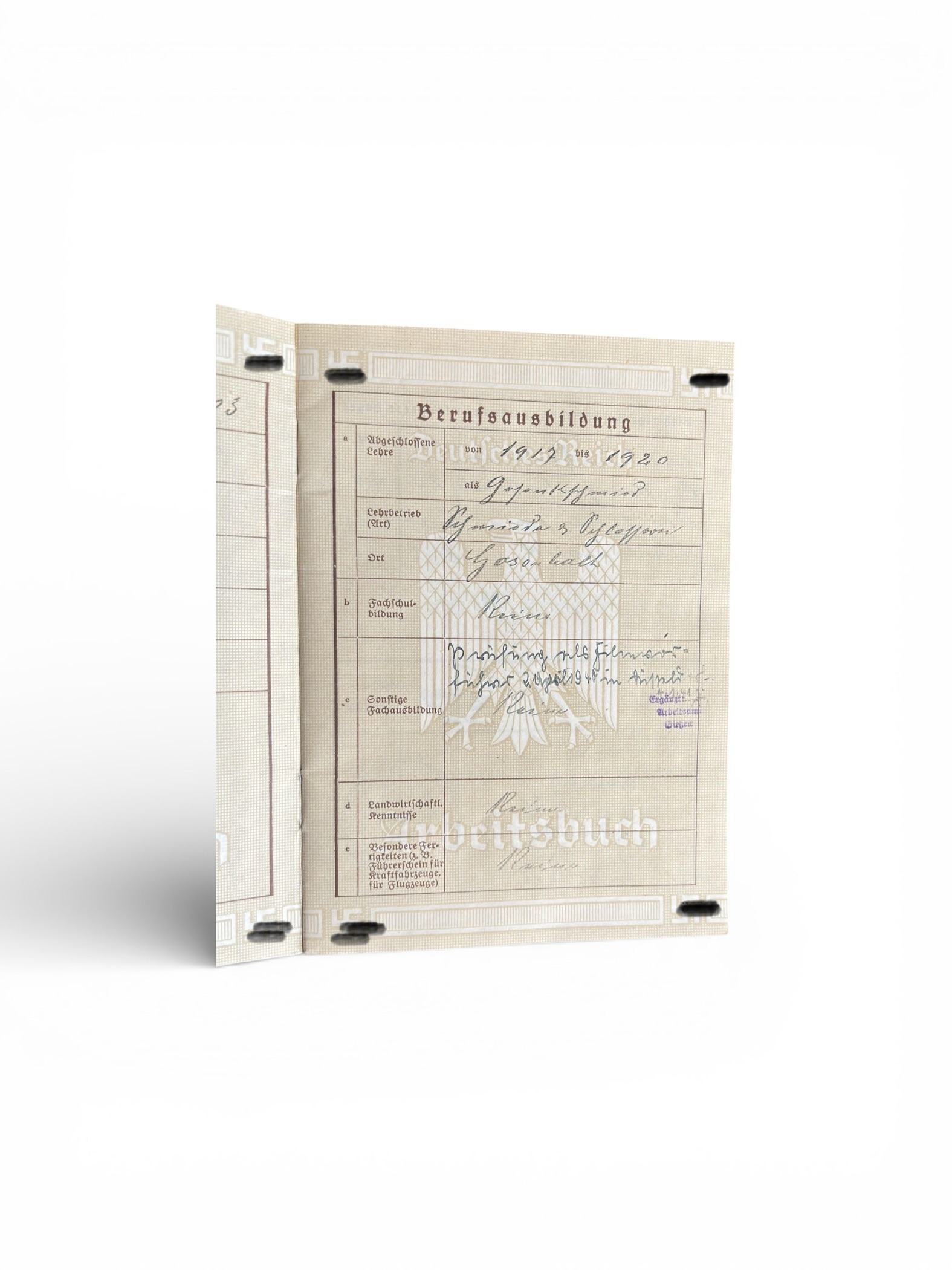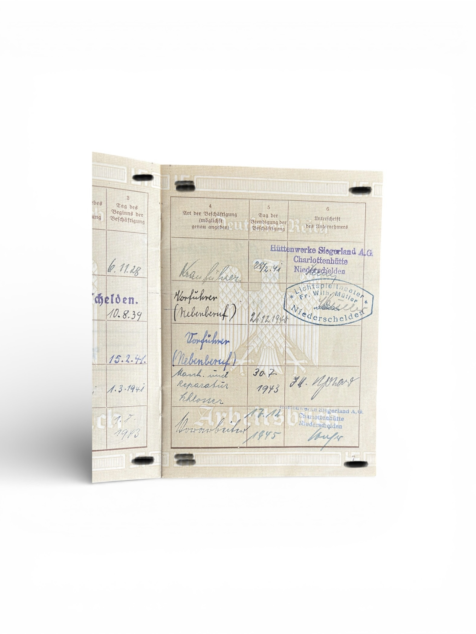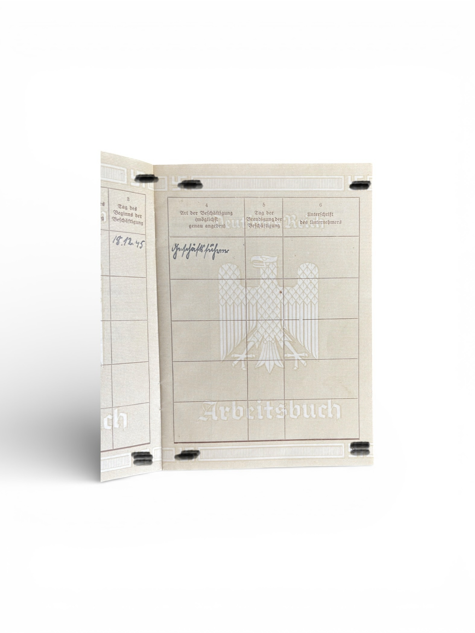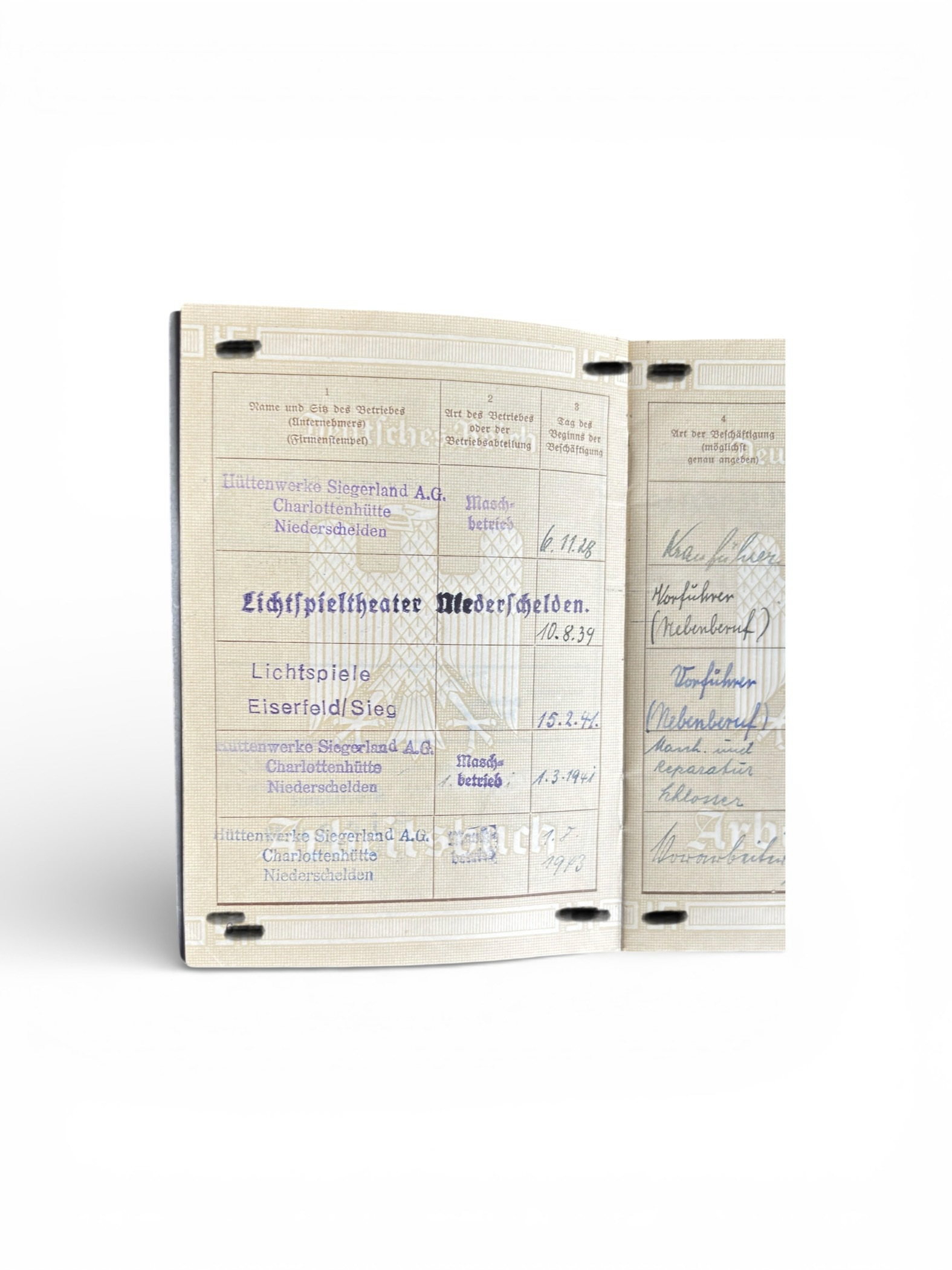 Authentique livret de travail allemand (Arbeitsbuch) délivré sous le Troisième Reich. Ce document officiel servait à enregistrer l’identité du travailleur ainsi que son parcours professionnel.