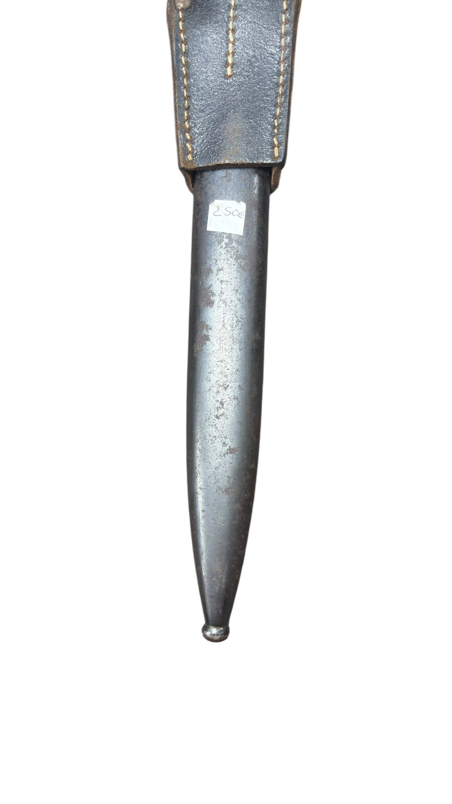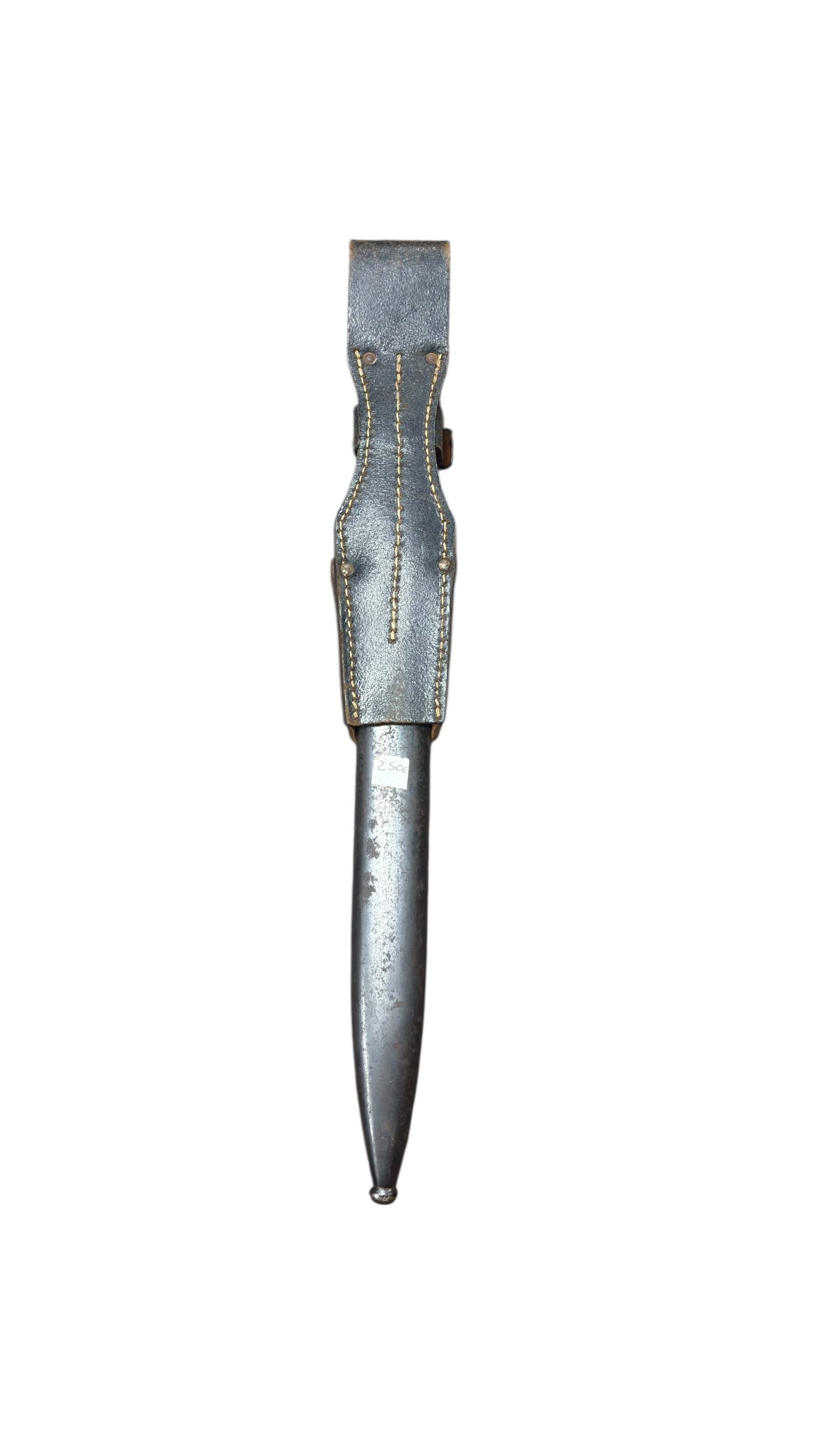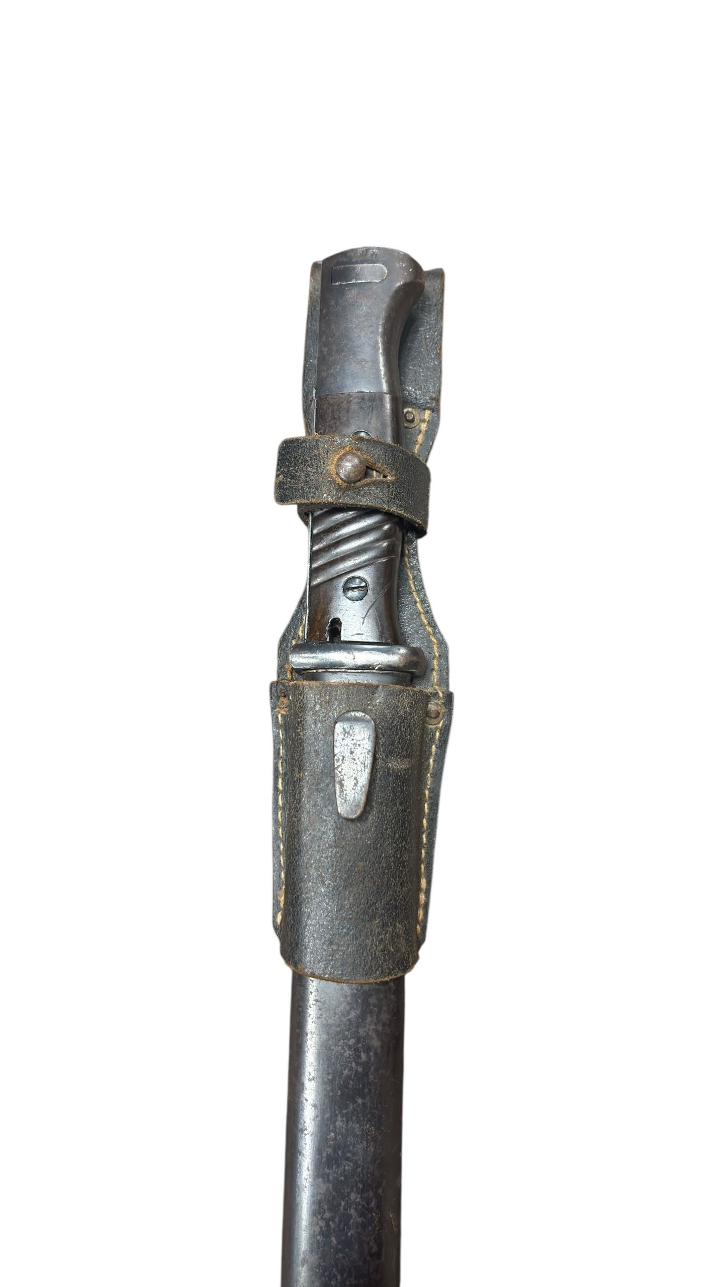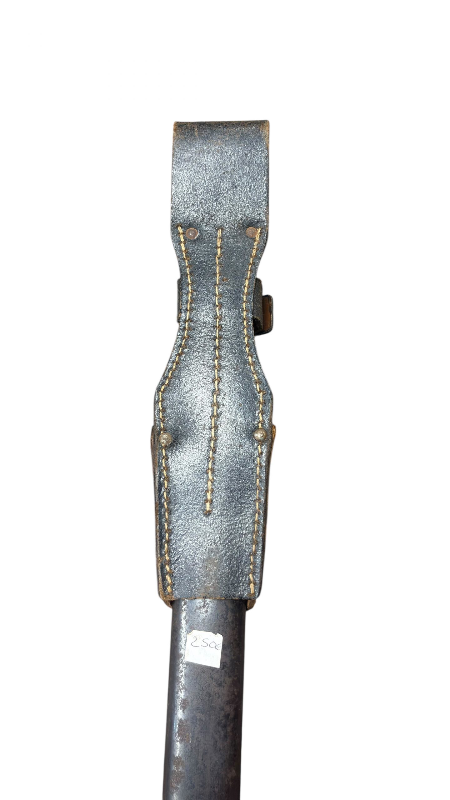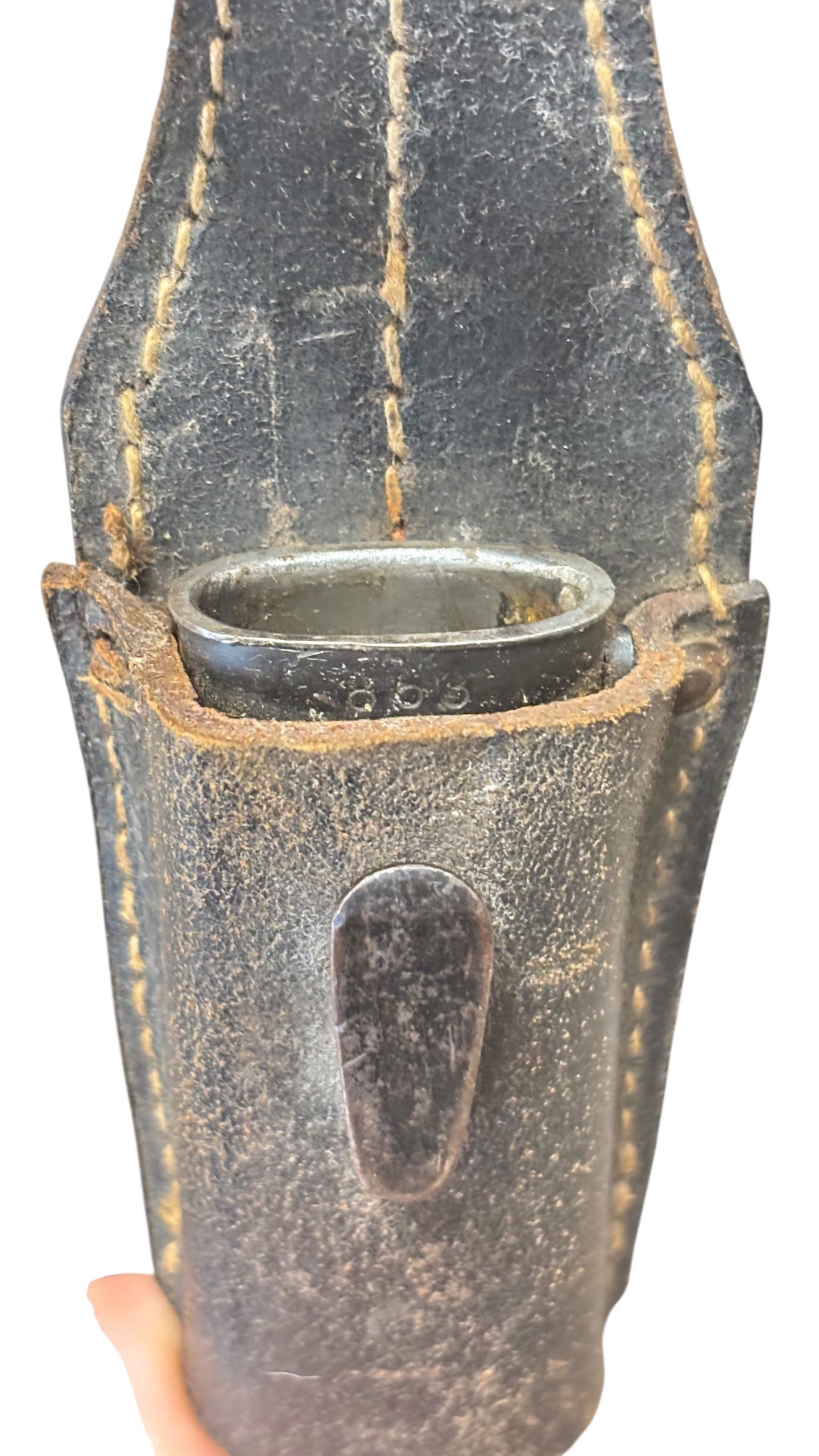 Son porte-baïonnette en cuir en bon état, avec coutures solides et fermeture encore fonctionnelle.