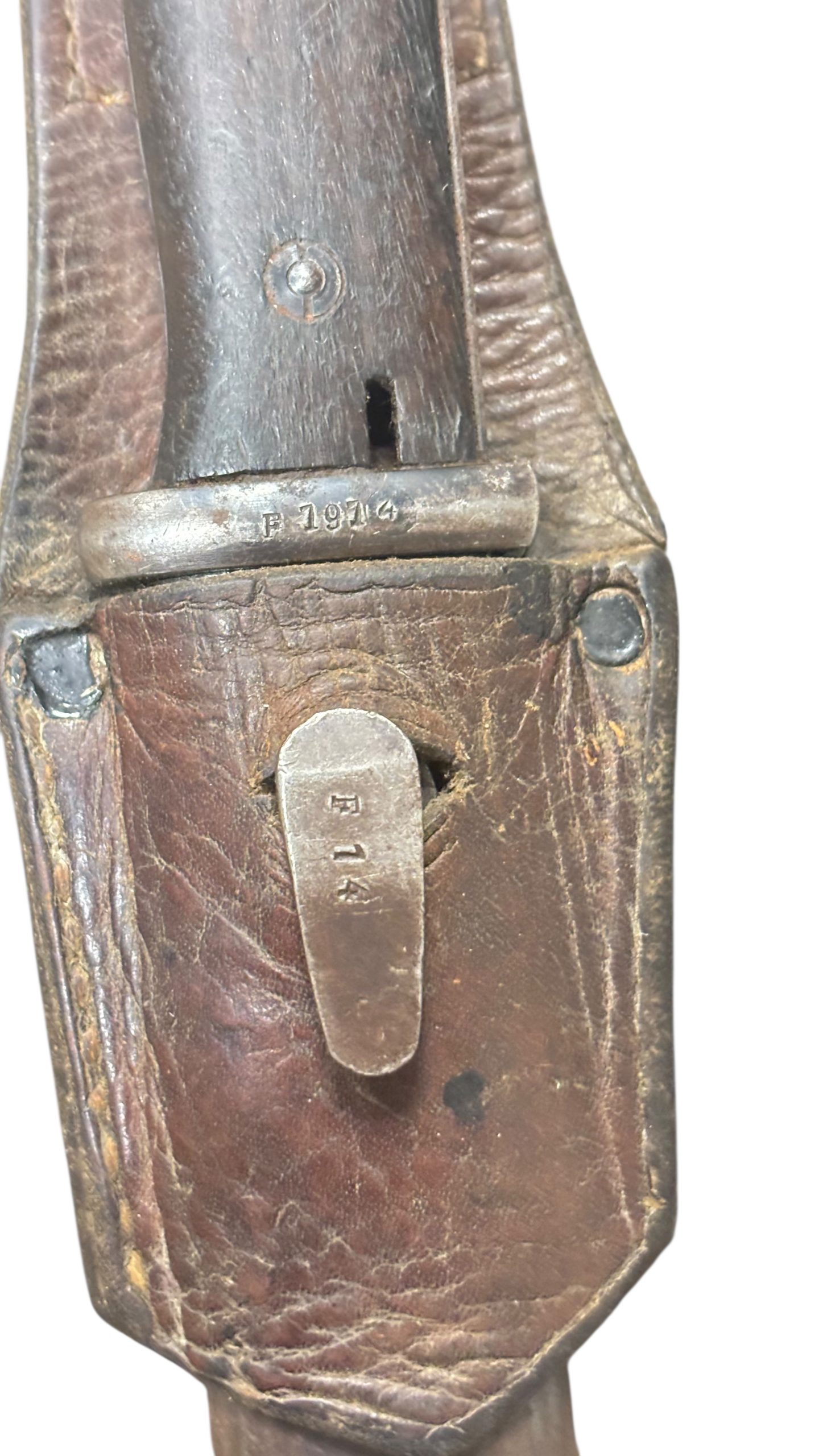 Le crochet d’agrafe du fourreau sans stries porte un préfixe d’une lettre et les deux derniers chiffres du numéro de série inscrit sur la croisière F14 ici