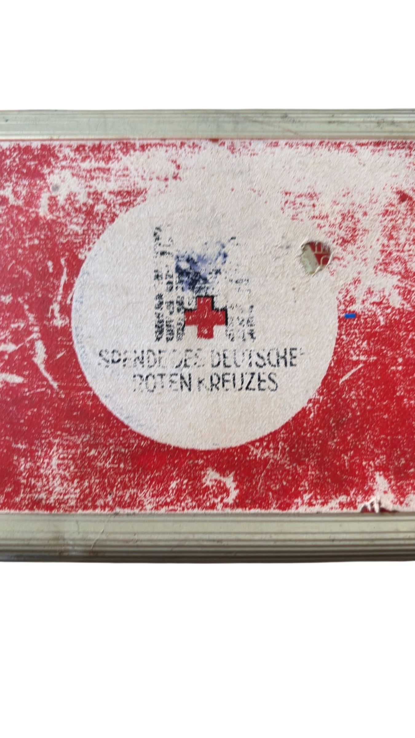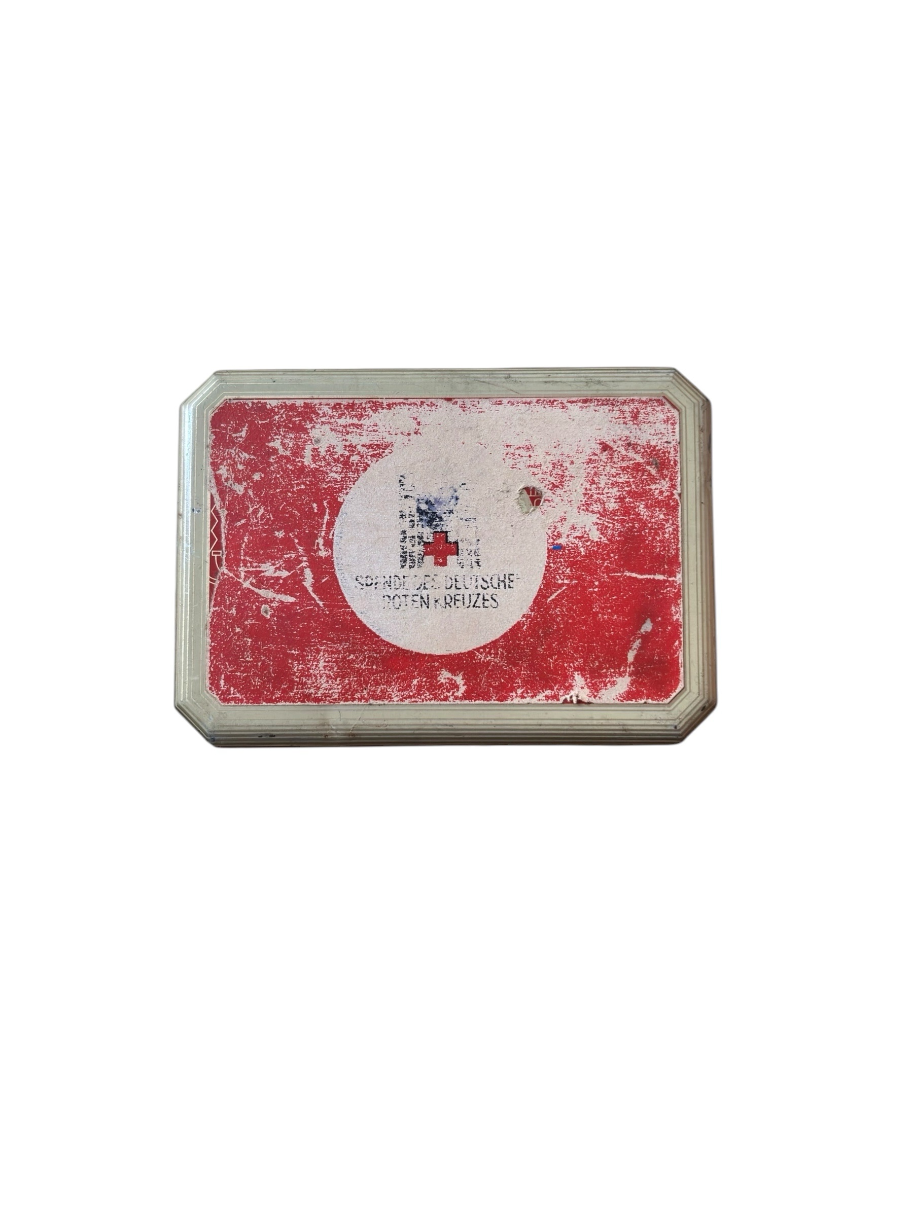 Elle servait probablement de boîte à dons ou de collecte La surimpression avec le logo et le texte de la Croix-Rouge allemande indique une réutilisation dans le cadre d’une collecte de dons (ou comme boîte de charité déposée dans des lieux publics).