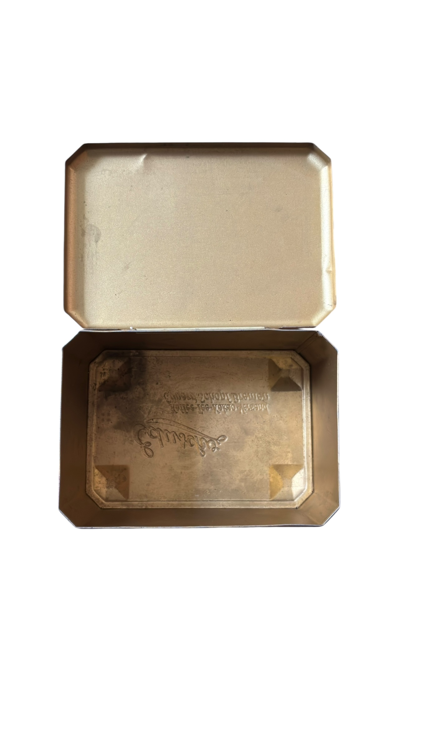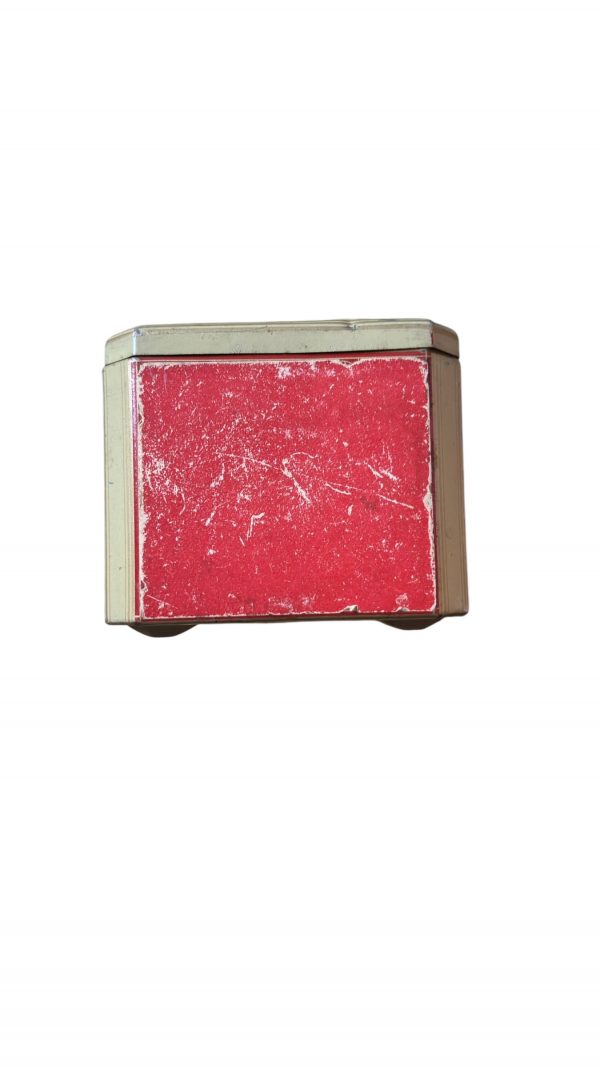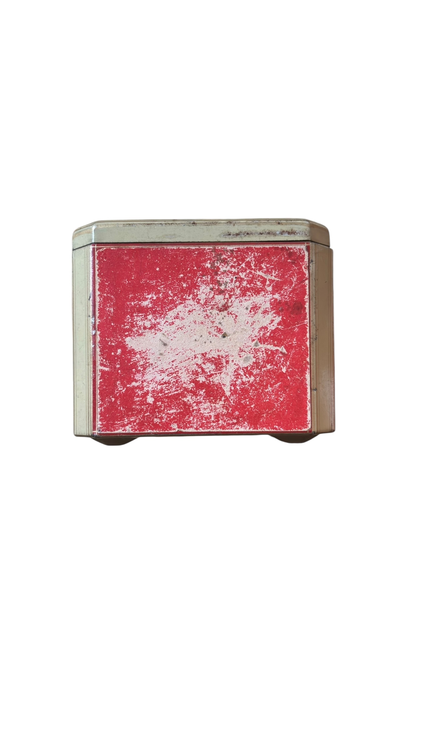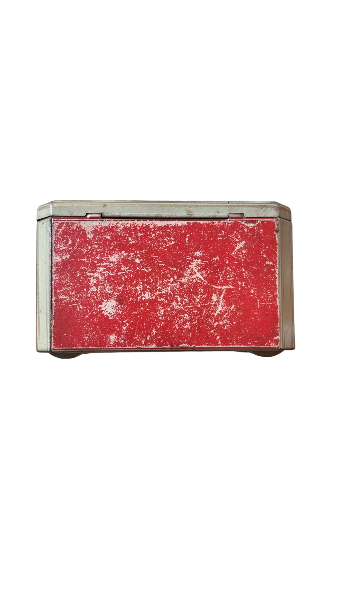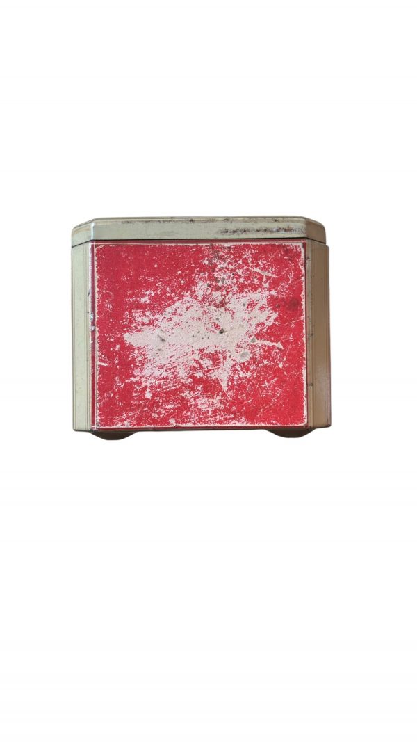 Boîte métallique allemande de marque Eduscho (Bremen), réemployée avec une mention “Spende an das Deutsche Rote Kreuz” (don à la Croix-Rouge allemande).