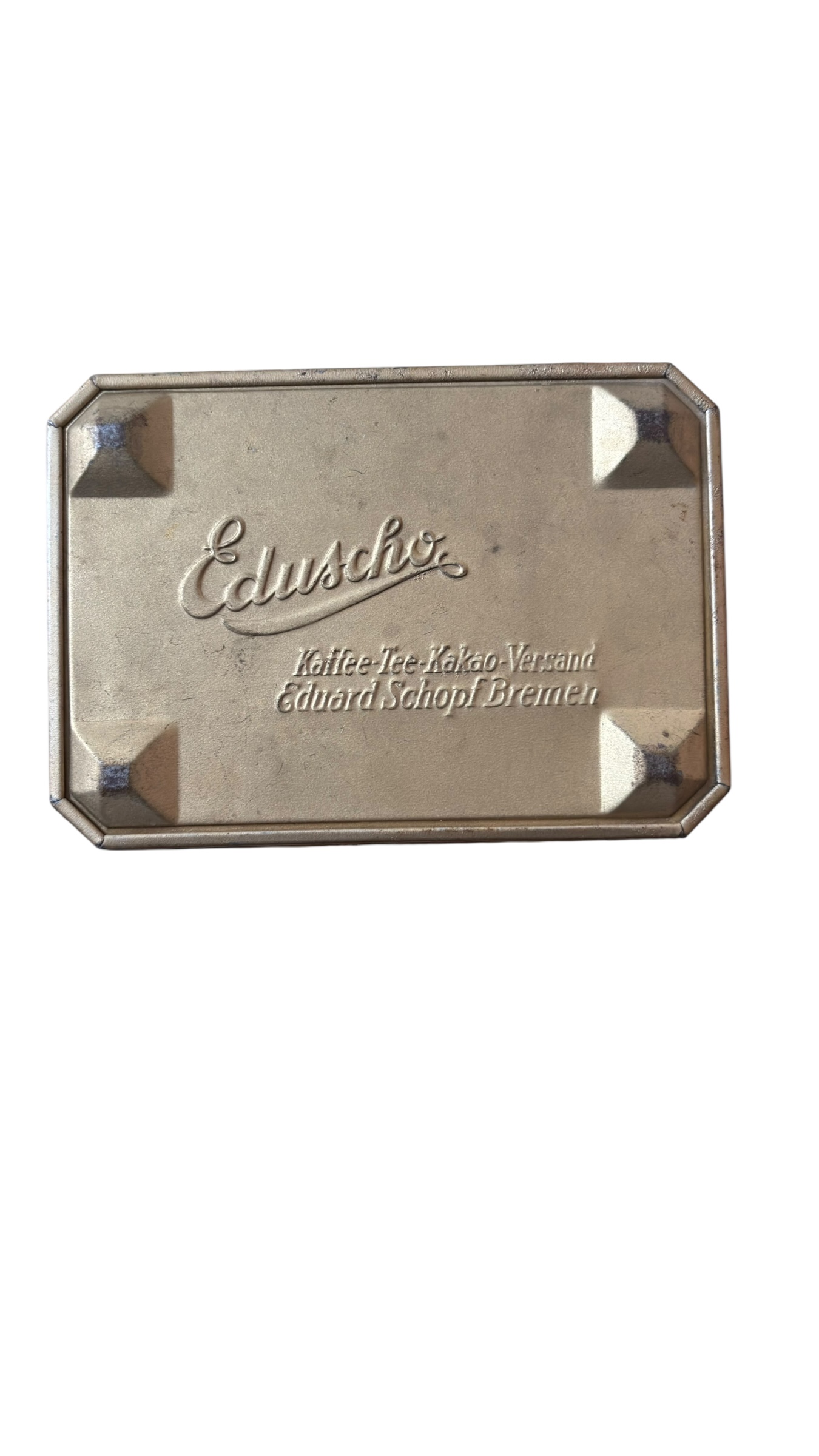 Marquage en relief : “Eduscho – Kaffee, Tee, Kakao-Versand – Eduard Schopf Bremen”.Cela correspond à la marque Eduscho, entreprise allemande de torréfaction fondée à Brême en 1924