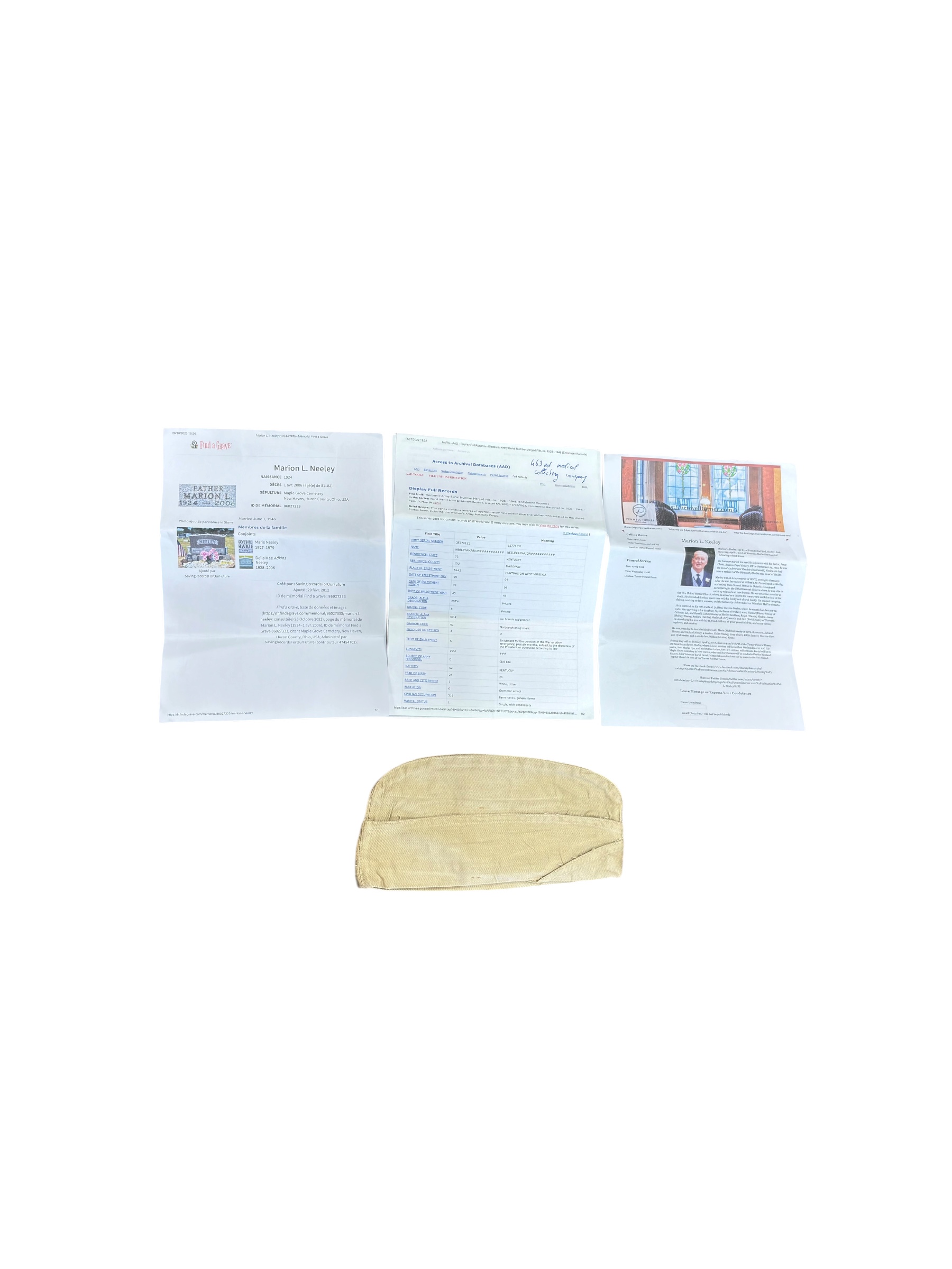 Calot US Army Medical Corps WW2 original nominatif , attribué au soldat américain Marion L NEELEY