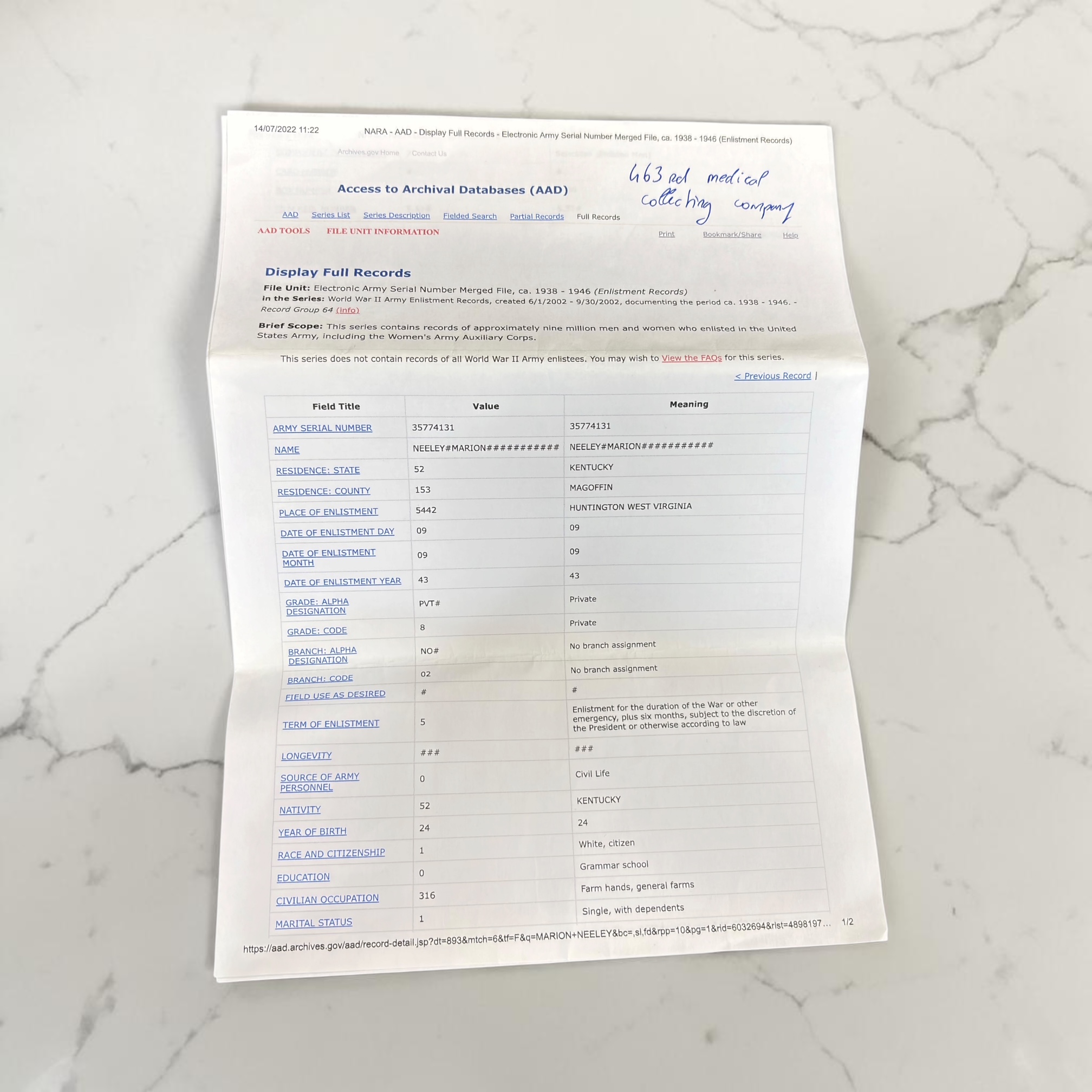 Calot US WWII nominatif 463rd Medical Collecting Company