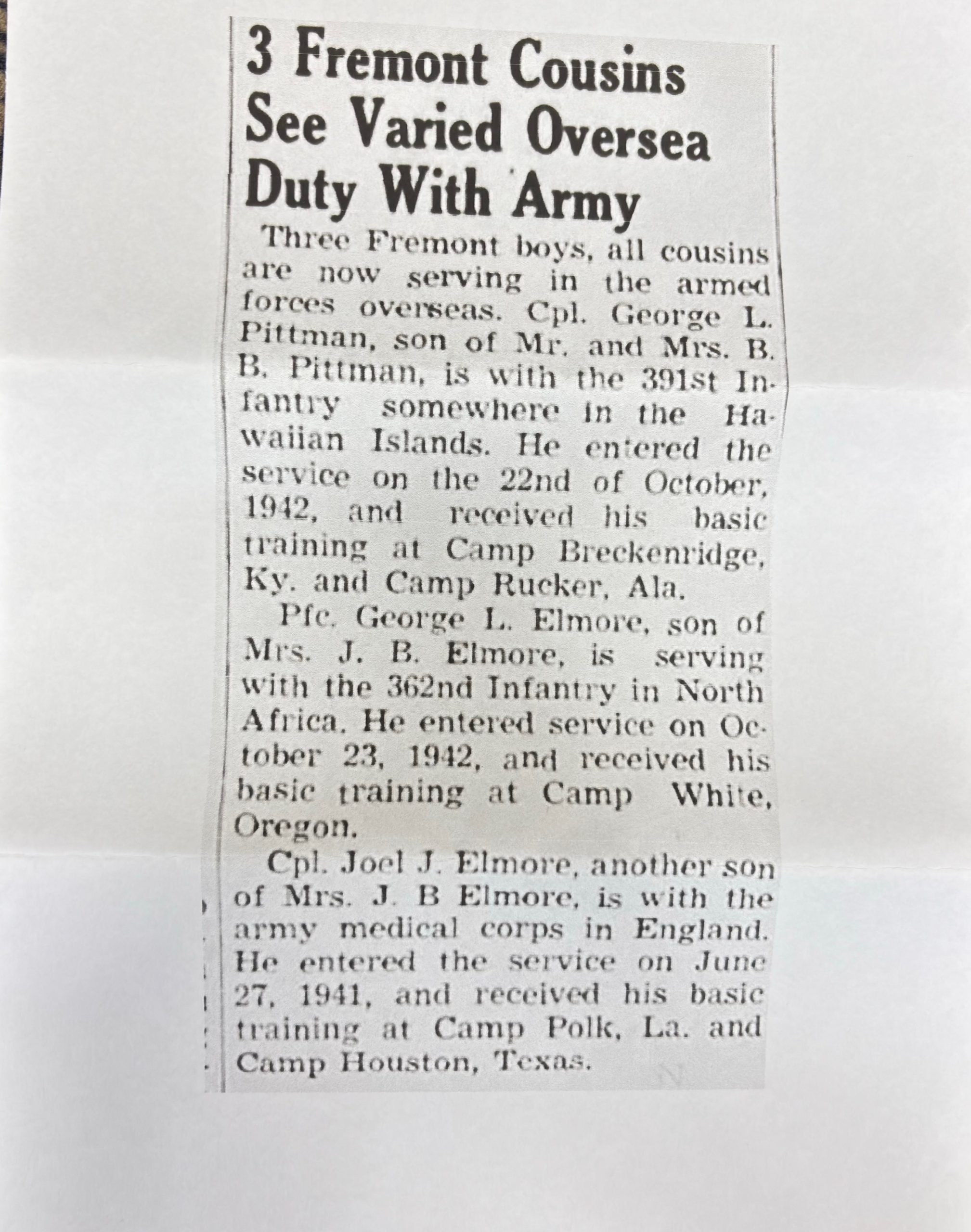 Un article de presse d’époque indique que George L. Elmore sert en Afrique du Nord, confirmant son engagement outre-mer pendant le conflit.