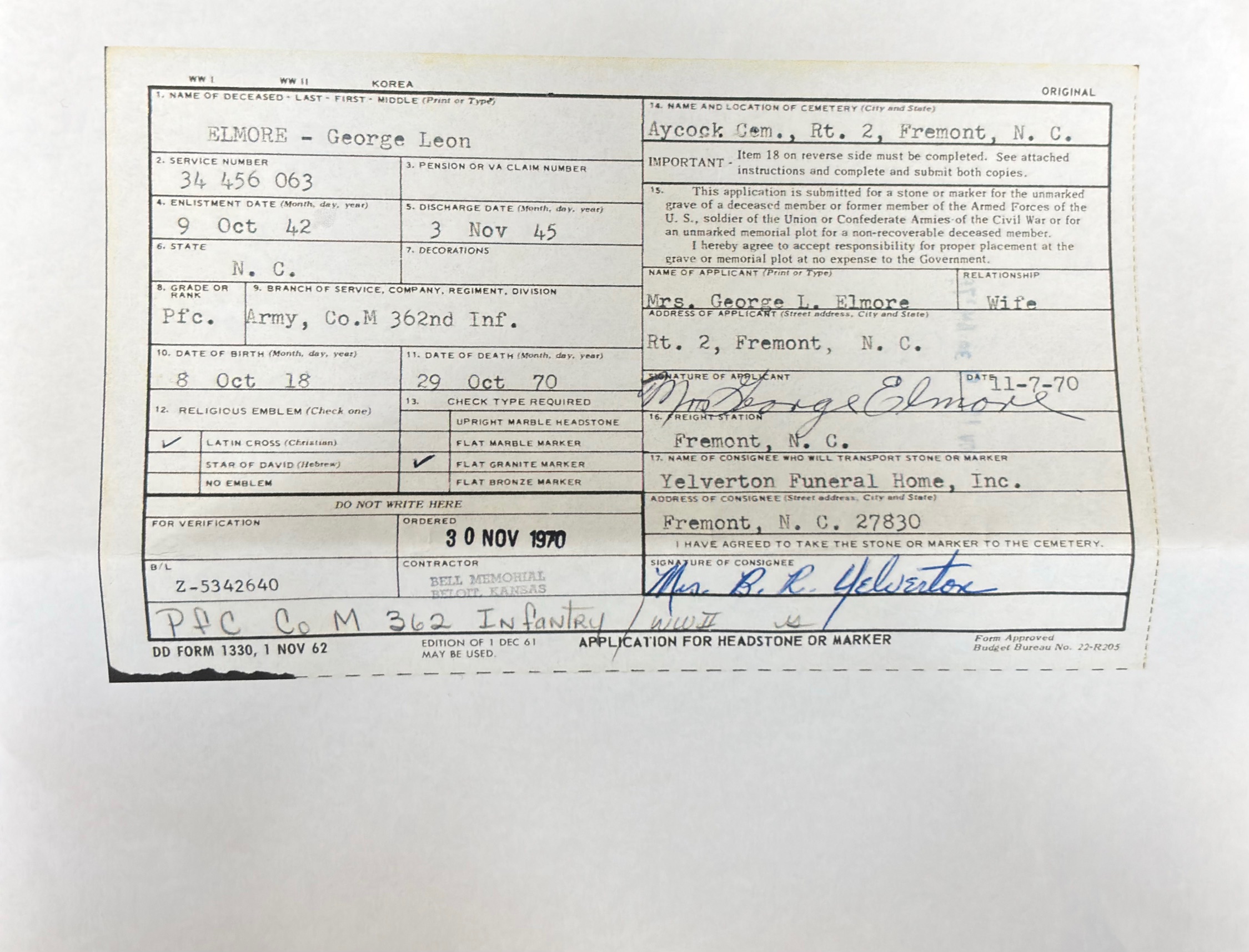 L’ensemble comprend également un document officiel d’après-guerre relatif à sa sépulture (headstone application), confirmant son identité, son unité (Company M, 362nd Infantry) ainsi que ses dates de service.