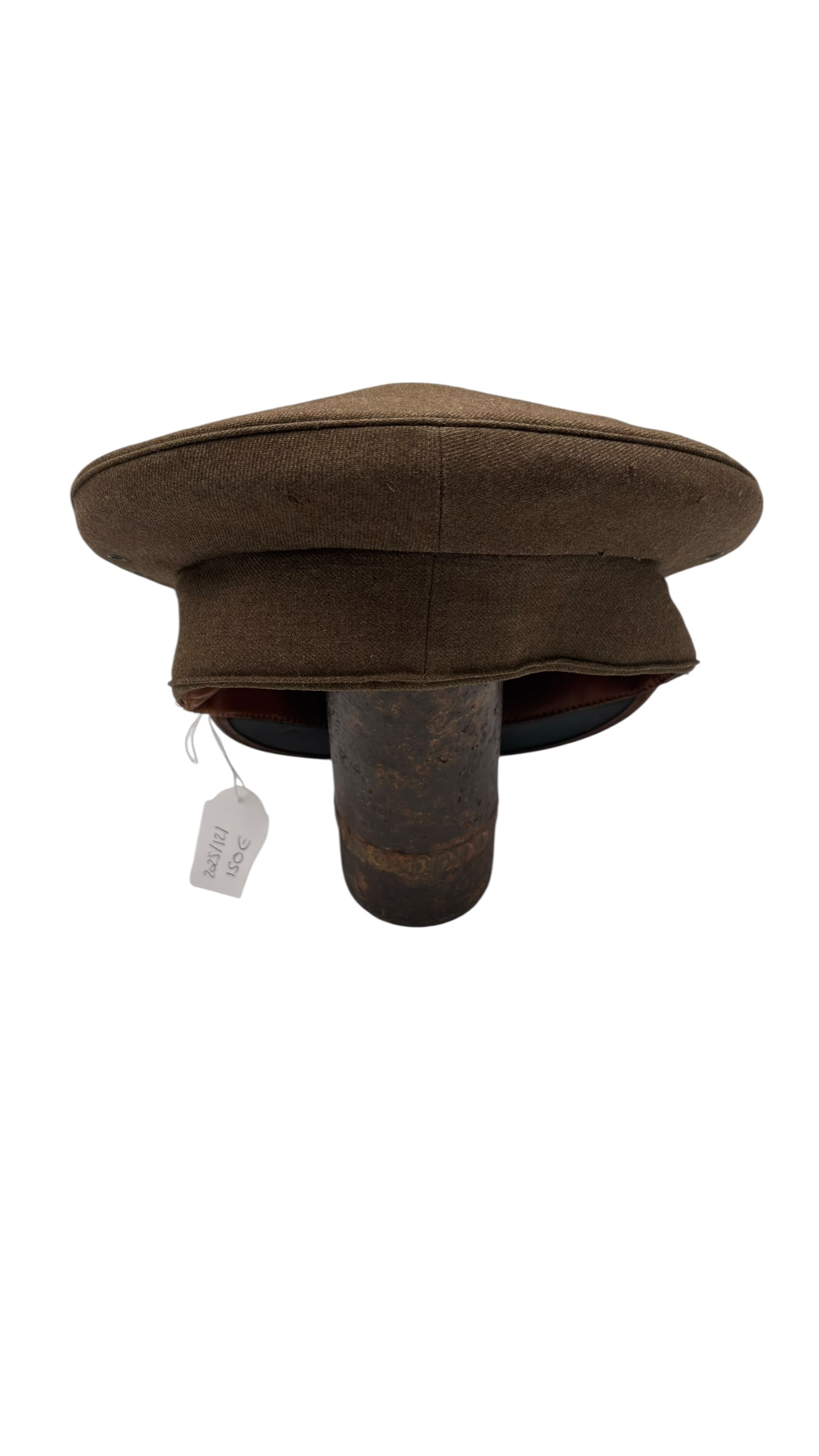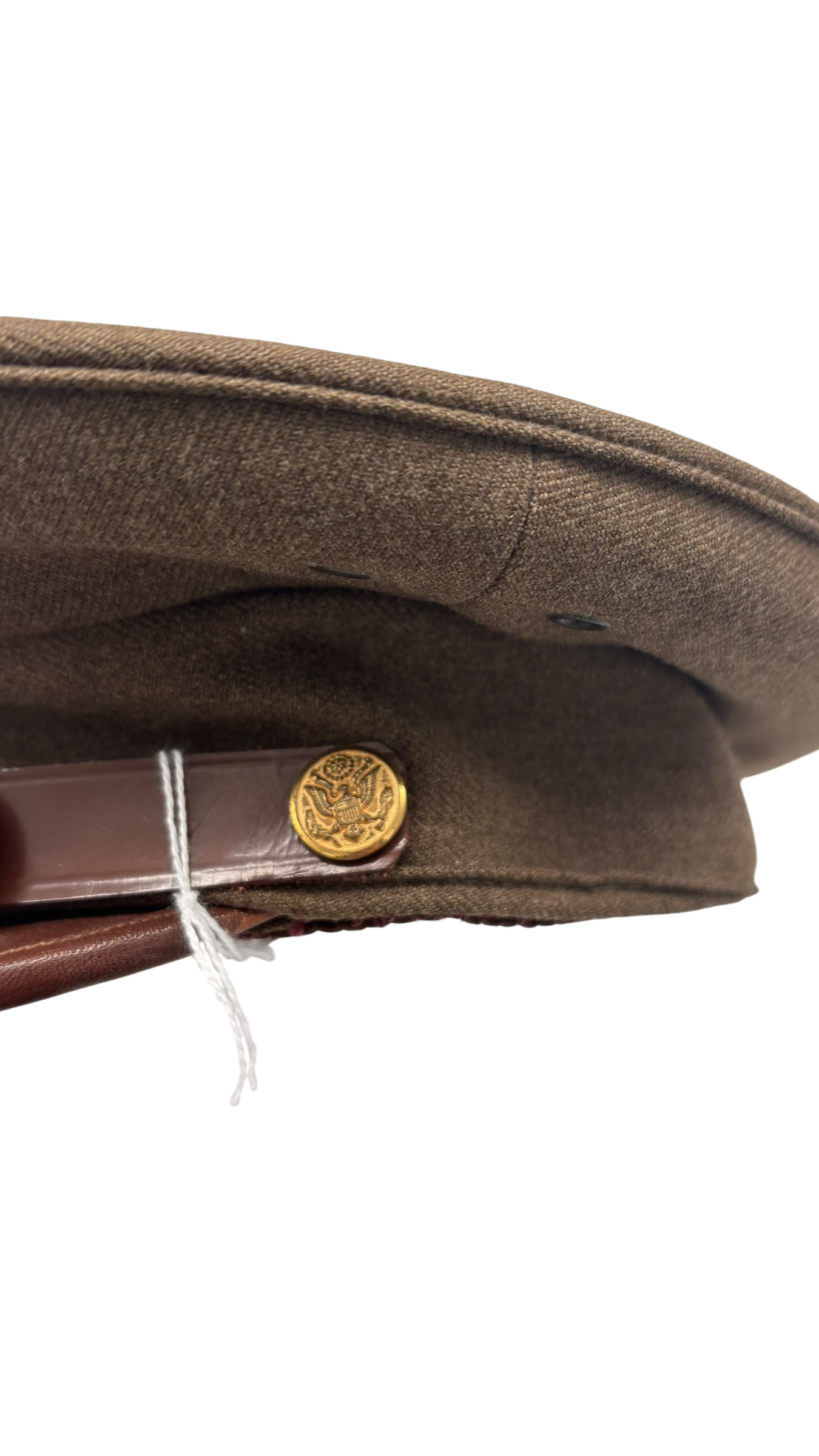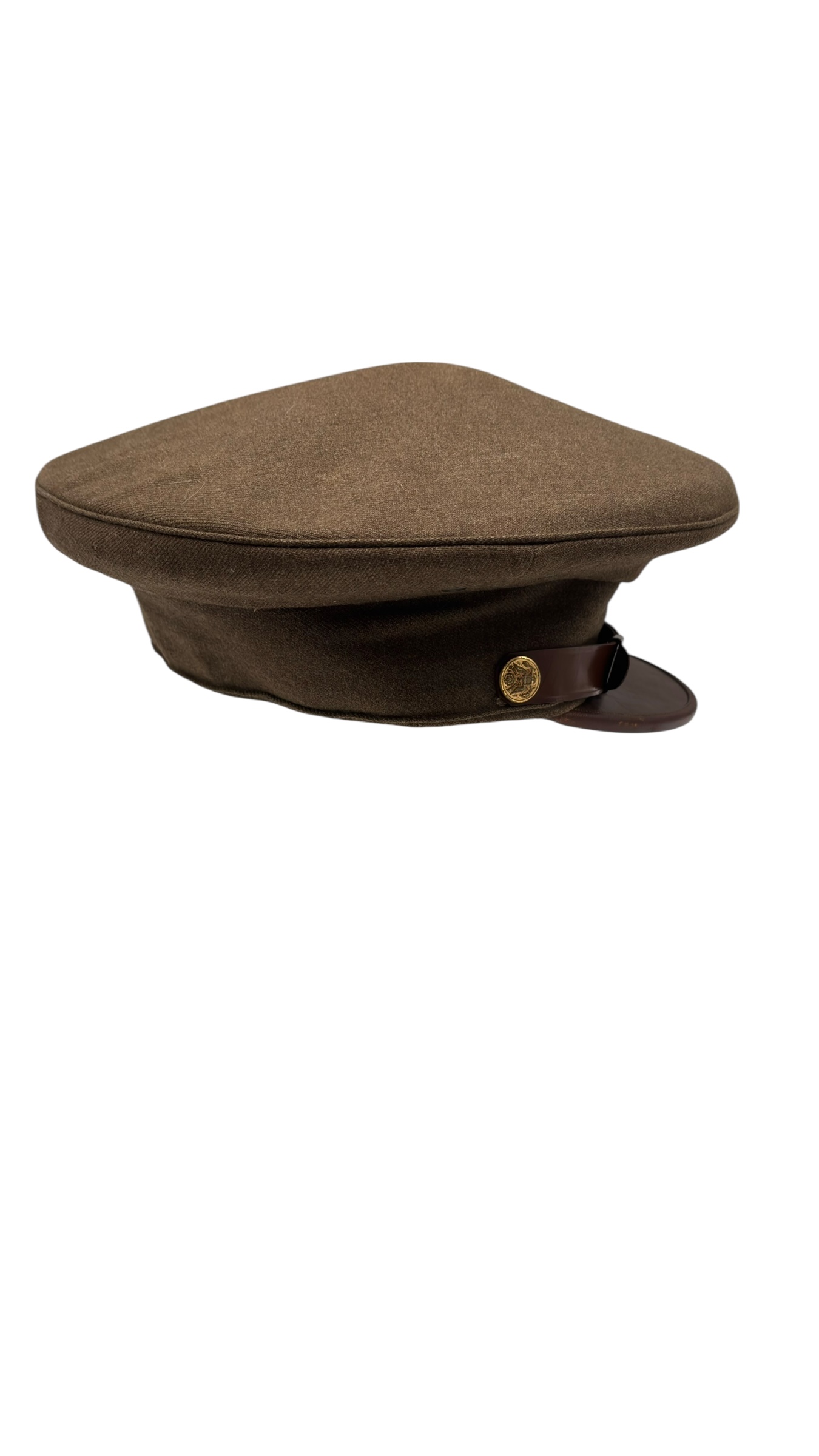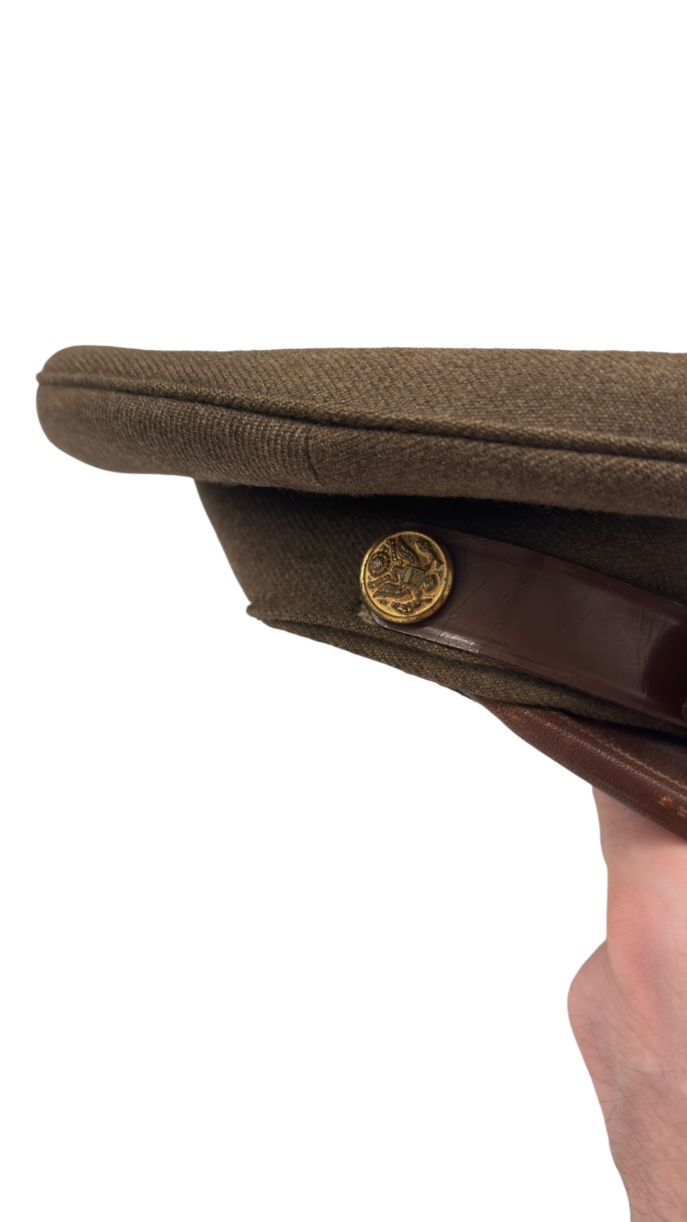 Corps en laine couleur olive drab,Jugulaire et visière en cuir brun,Intérieur avec doublure en toile et cuir, estampille “Knox” bien lisible.