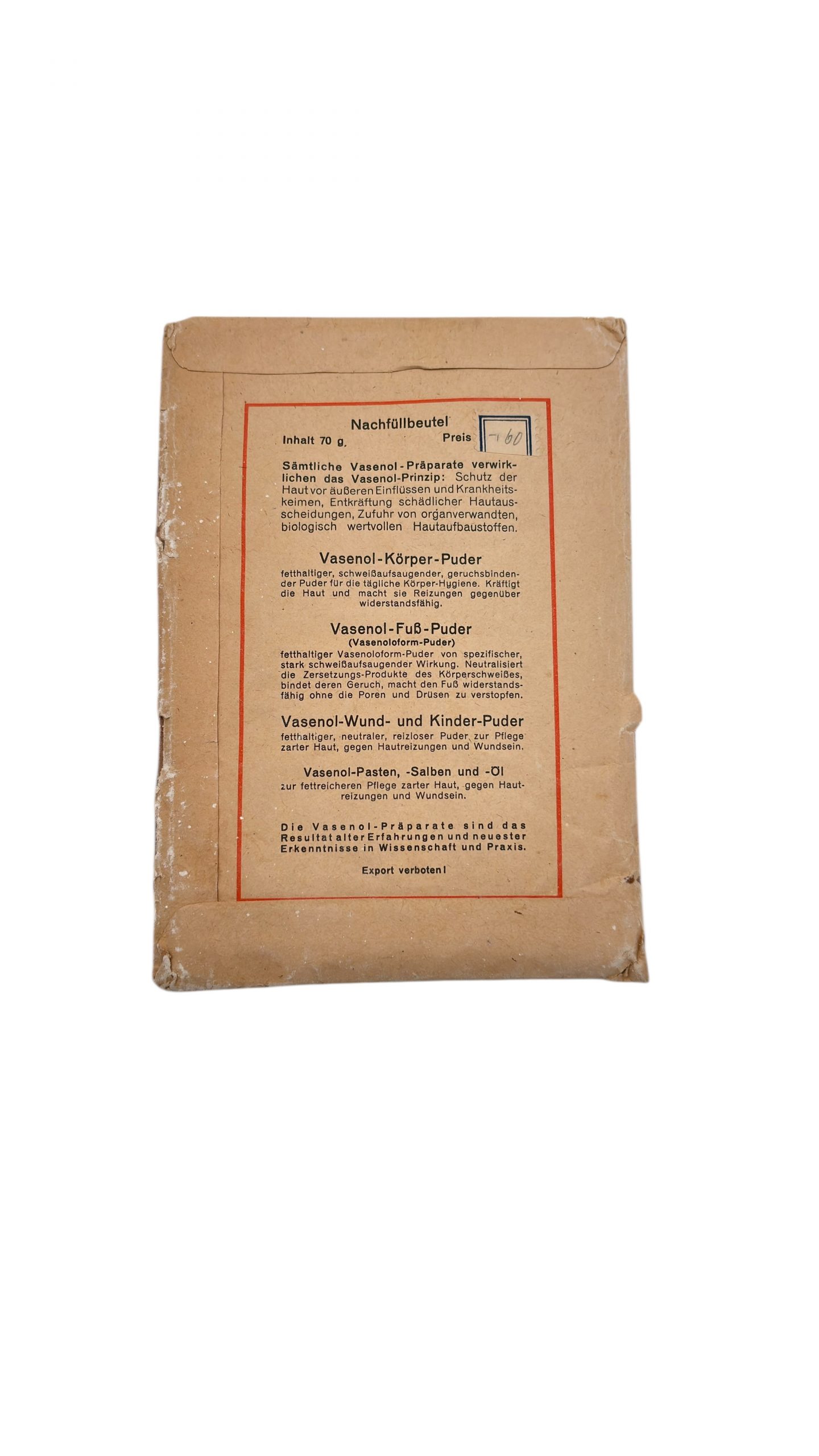 Paquet de poudre pour les pieds (“Fuß-Puder”) de la marque Vasenol, produit en Allemagne par la société Dr. Arthur Köpp K.G., Leipzig.