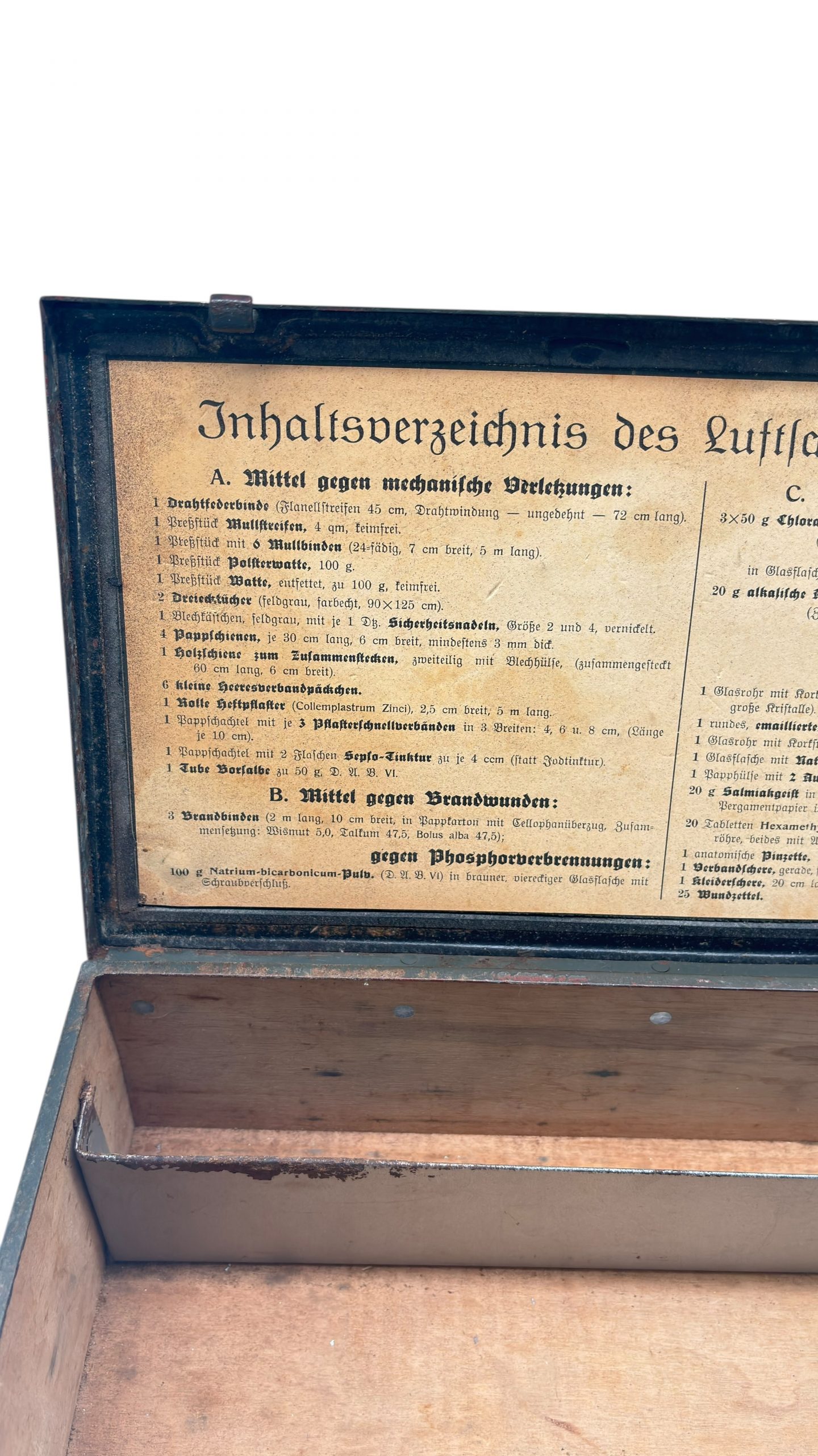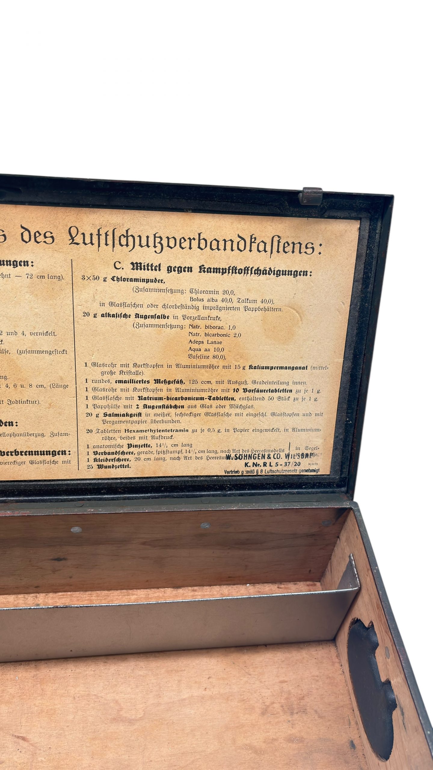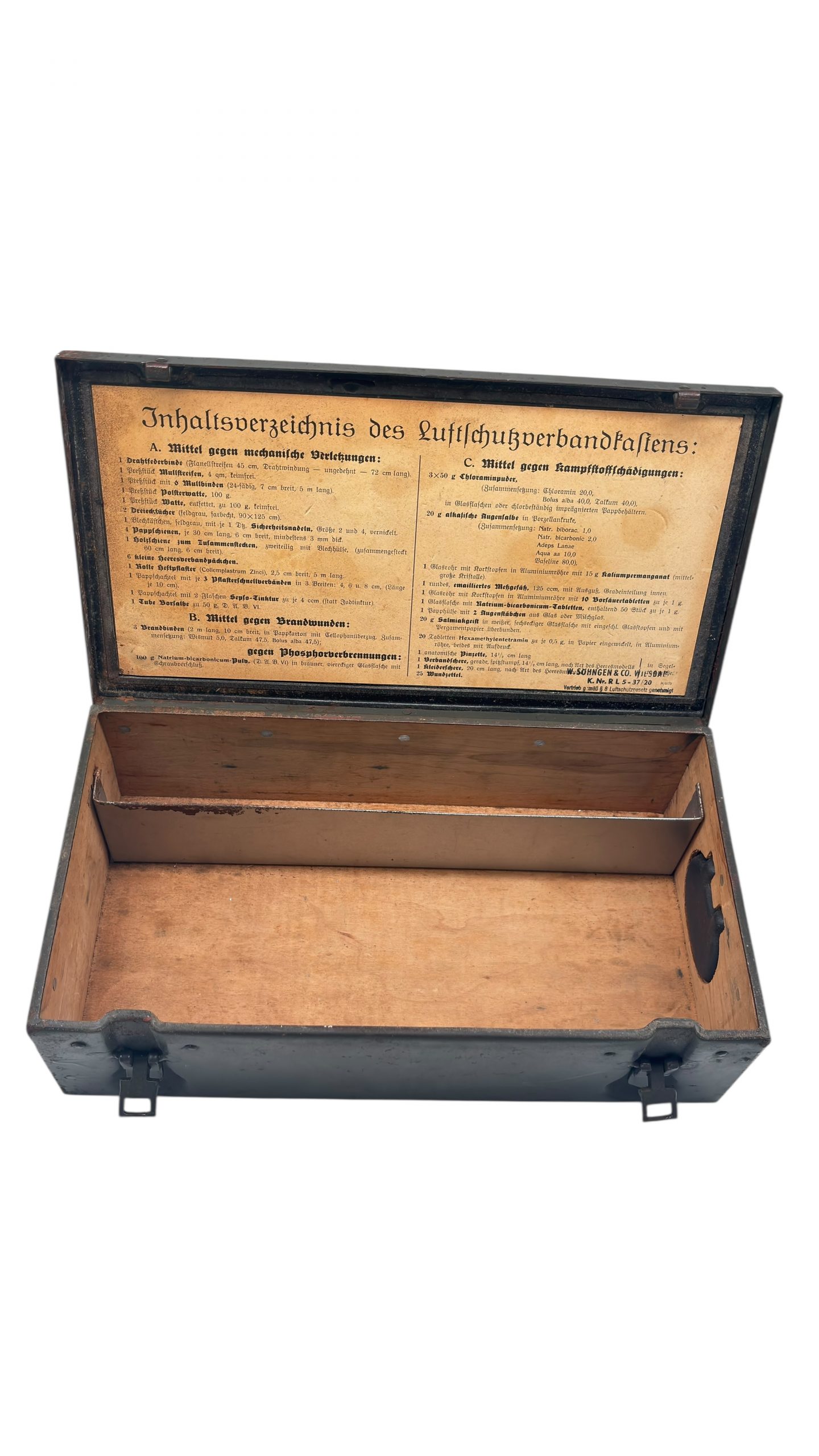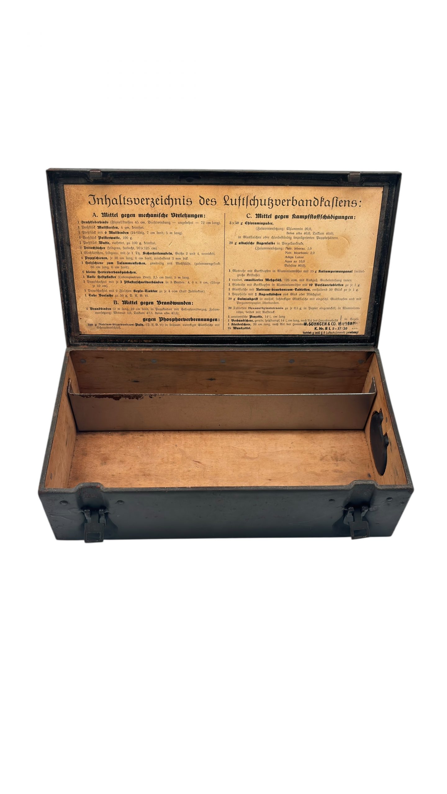 Étiquette originale : “Inhaltsverzeichnis des Luftschutzverbandkastens”, listant le contenu médical réglementaire (pansements, pommades, désinfectants, produits contre les brûlures et les gaz de combat).