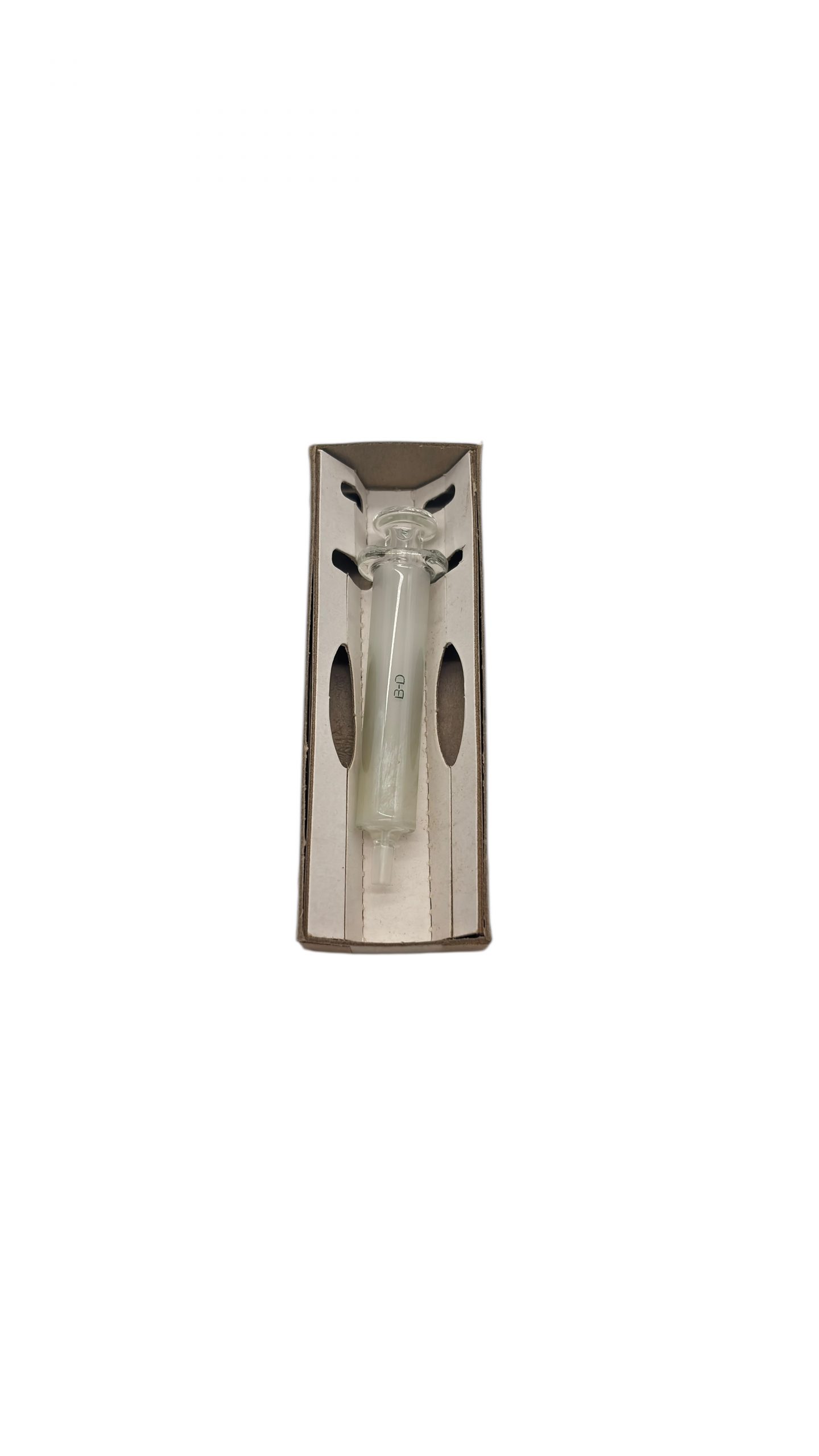Seringue en verre borosilicaté de 2 cc (millilitres), de type Luer, conservée dans sa boîte d’origine en carton brun.