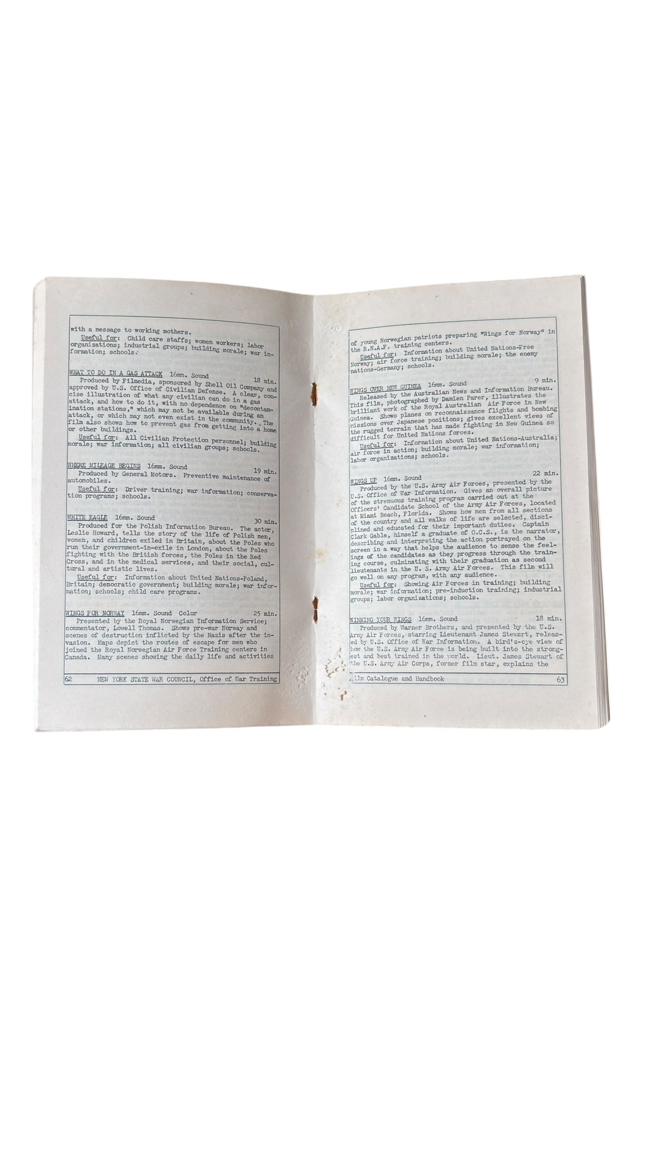 Ce petit manuel est donc un document officiel de l’État de New York datant de la Seconde Guerre mondiale, utilisé comme référence pour diffuser et organiser la projection de films de formation et d’information.