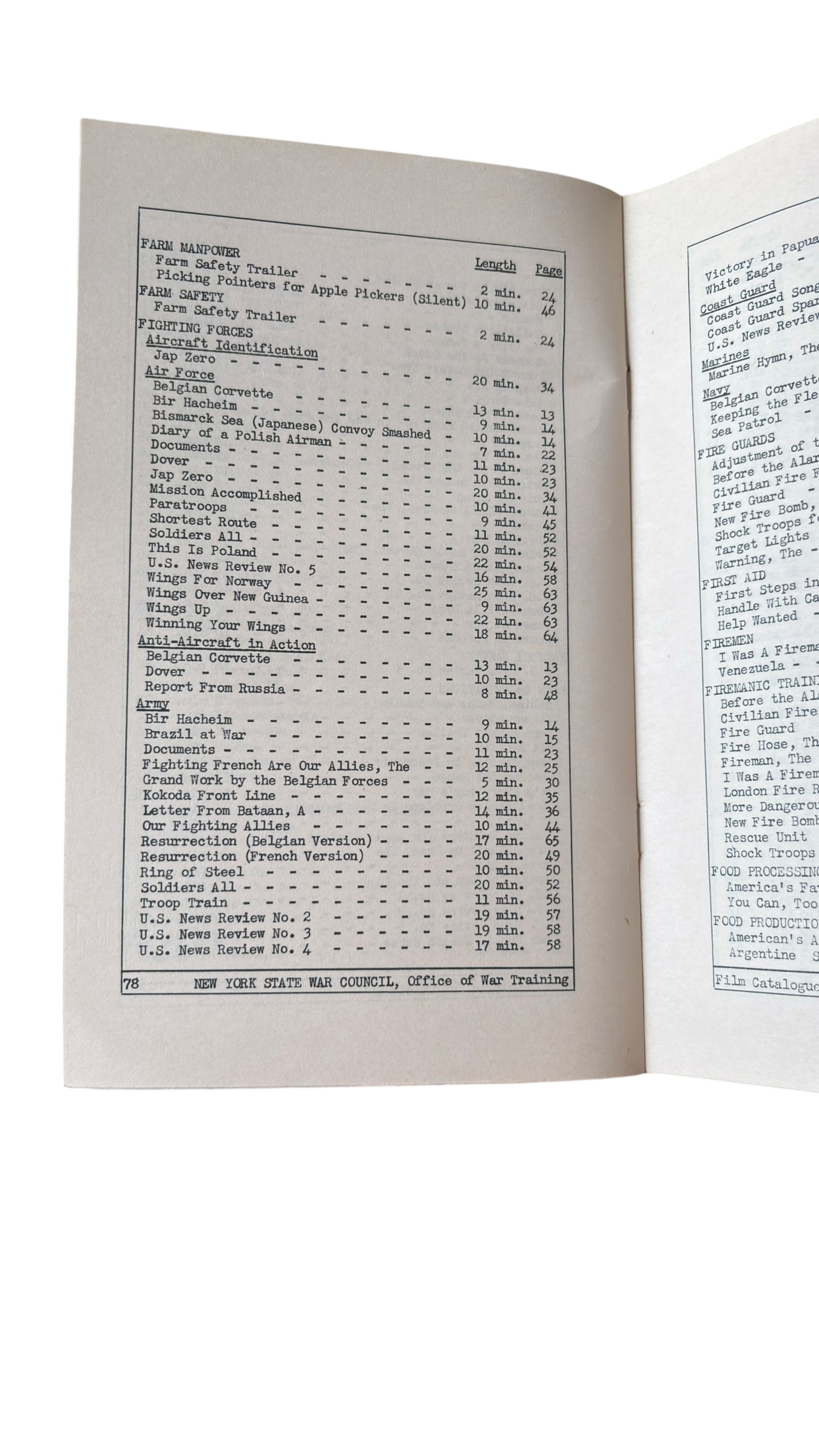 Livret intitulé “New York State War Film Catalogue and Handbook” (Catalogue et manuel des films de guerre de l’État de New York)