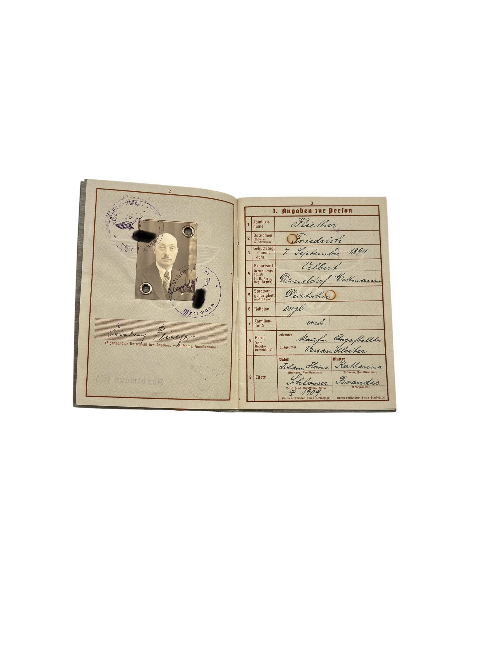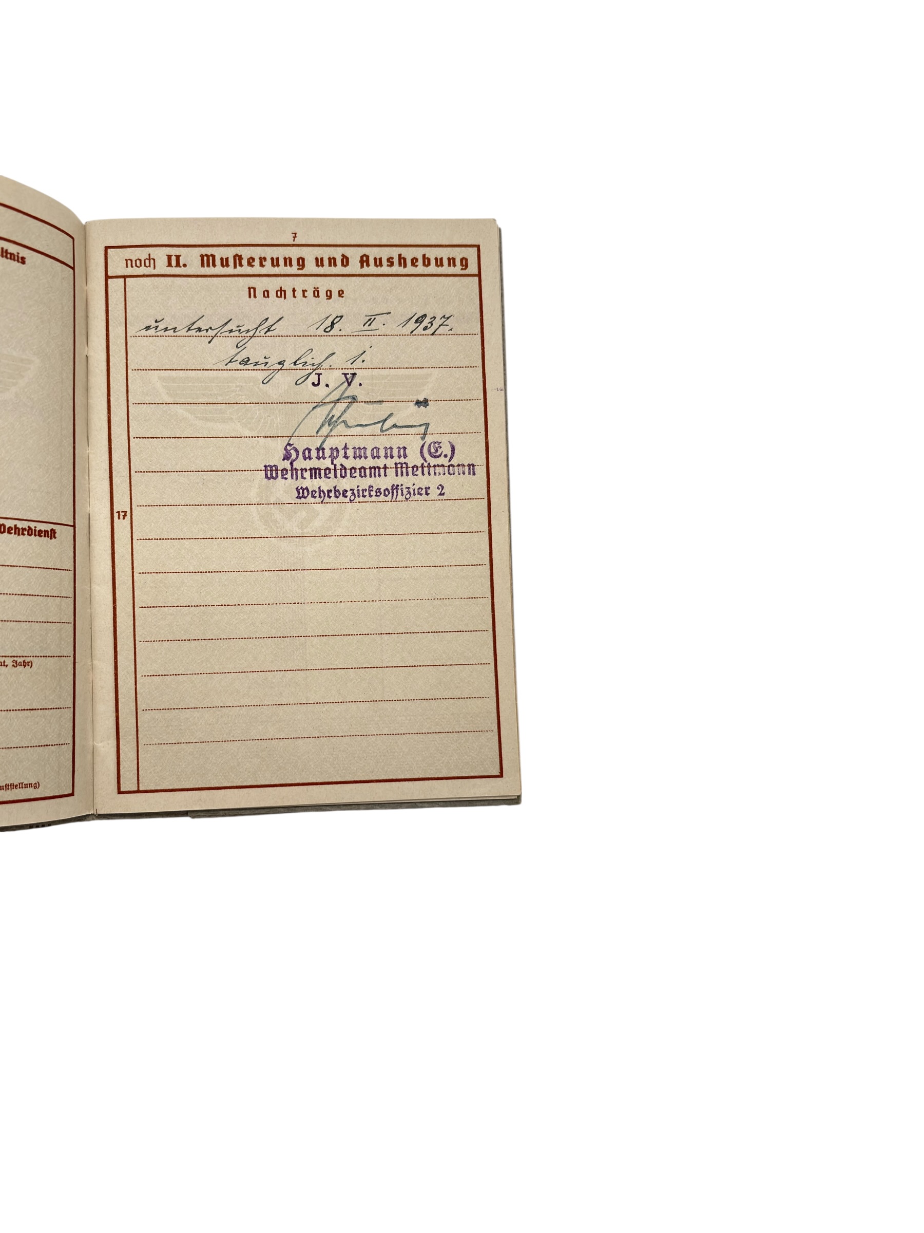 Le document est délivré par le bureau militaire de Mettmann le 2 août 1937, dans le cadre de l’organisation militaire de l’Allemagne avant la Seconde Guerre mondiale.