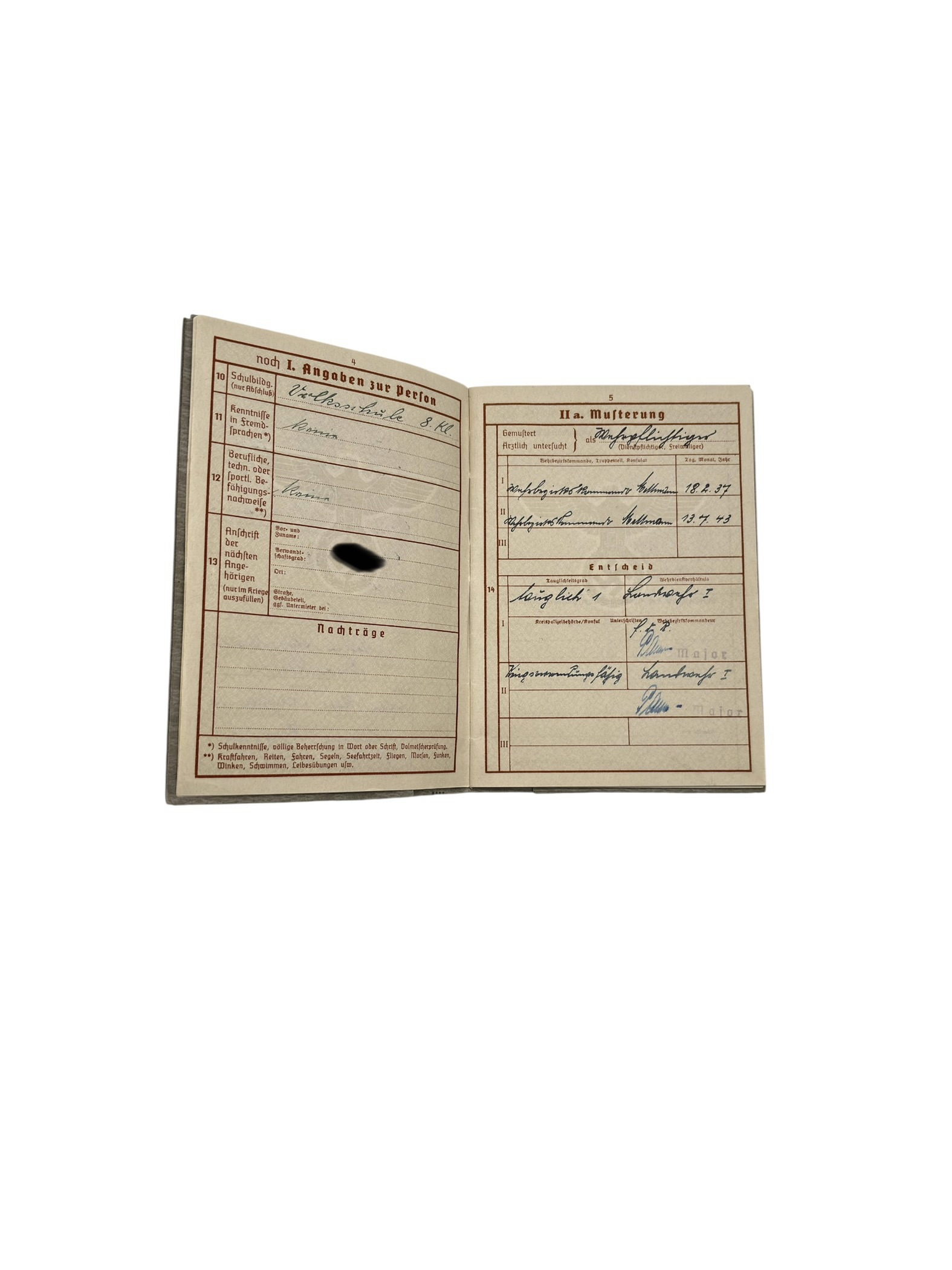 En 1937, Friedrich Flüther est examiné par les autorités militaires et déclaré apte au service (tauglich).