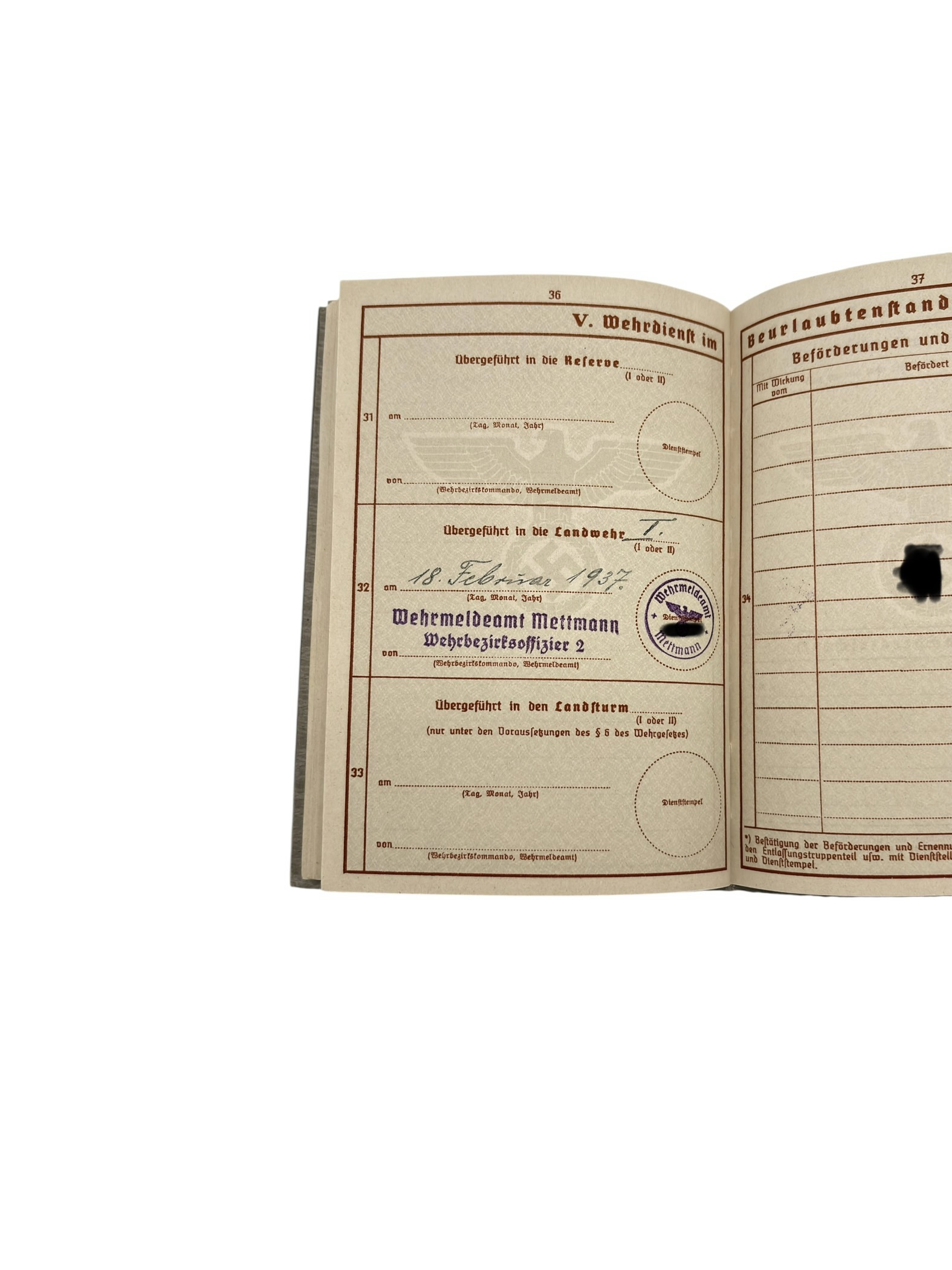 Le document indique également qu’il est versé dans la Landwehr le 18 février 1937, une catégorie de réserve de l’armée allemande regroupant généralement des soldats plus âgés
