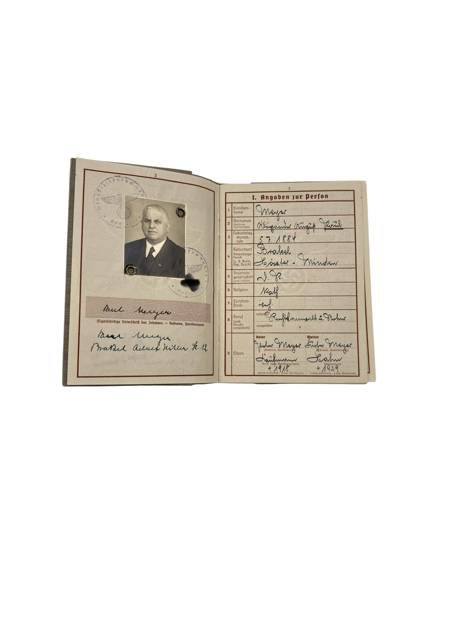 Lors de la création de ce Wehrpass en 1939, Emil Meyer est déjà un homme âgé de 55 ans.